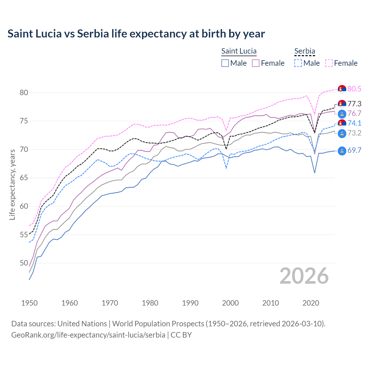 GeoRank.org/life-expectancy/saint-lucia/serbia | CC BY