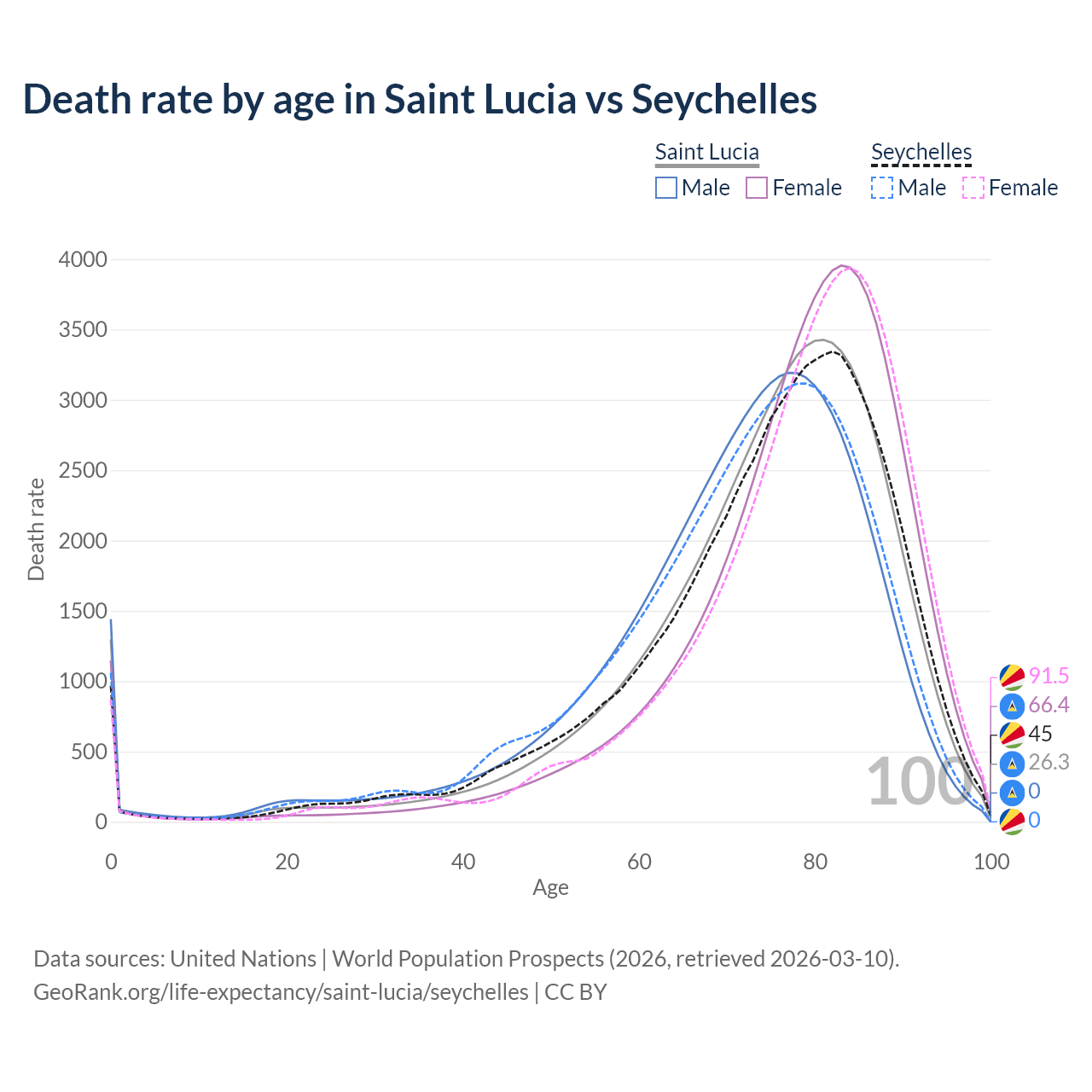 This life expectancy calculator shows the odds of living to 100, 95, 90, and below based on current age for both males and females in Saint Lucia and the Seychelles, along with mean and median age of death. The calculations are based on the 2026 life tables (actuarial tables) from the UN World Population Prospects.