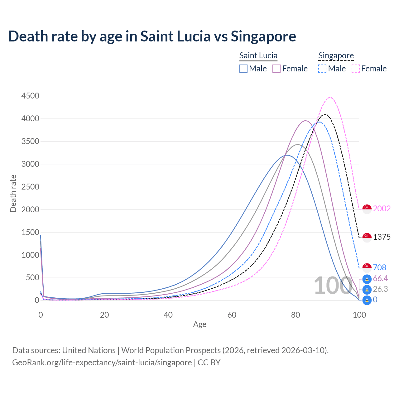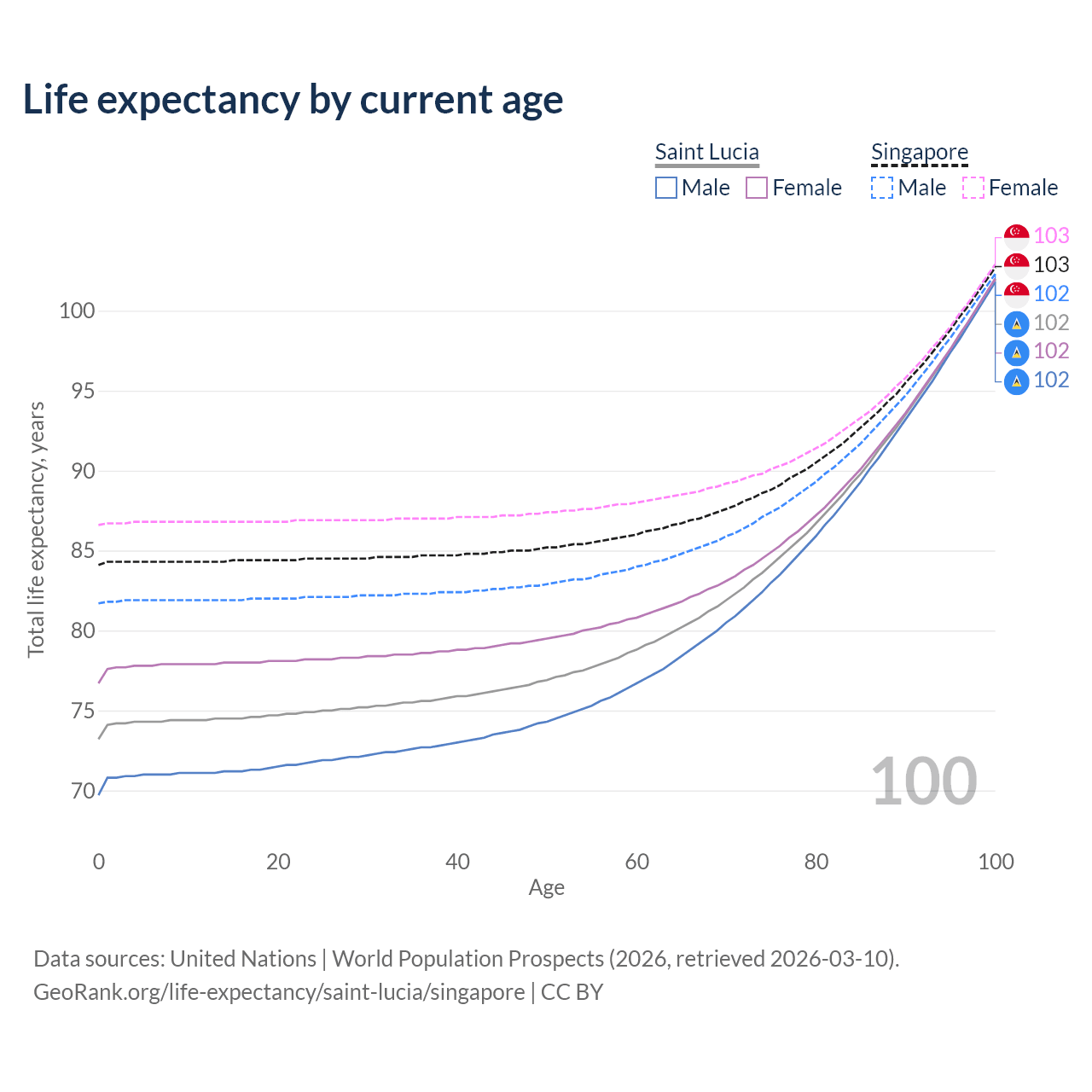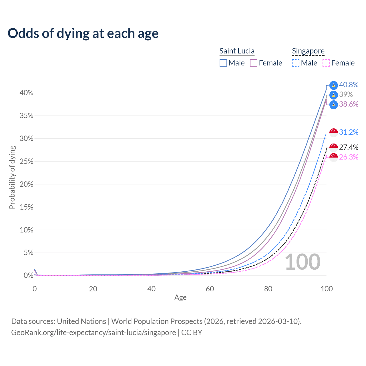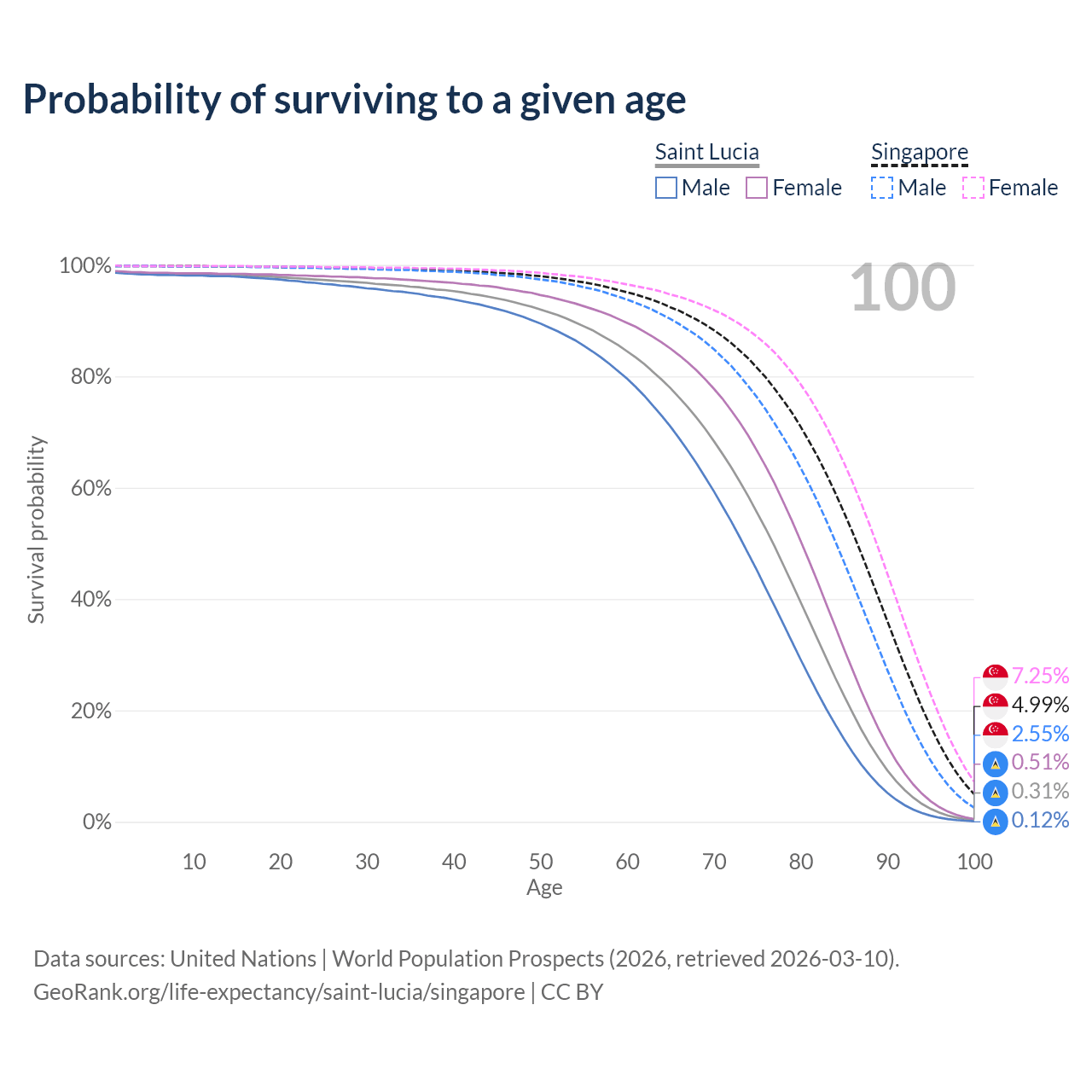 This life expectancy calculator shows the odds of living to 100, 95, 90, and below based on current age for both males and females in Saint Lucia and Singapore, along with mean and median age of death. The calculations are based on the 2026 life tables (actuarial tables) from the UN World Population Prospects.