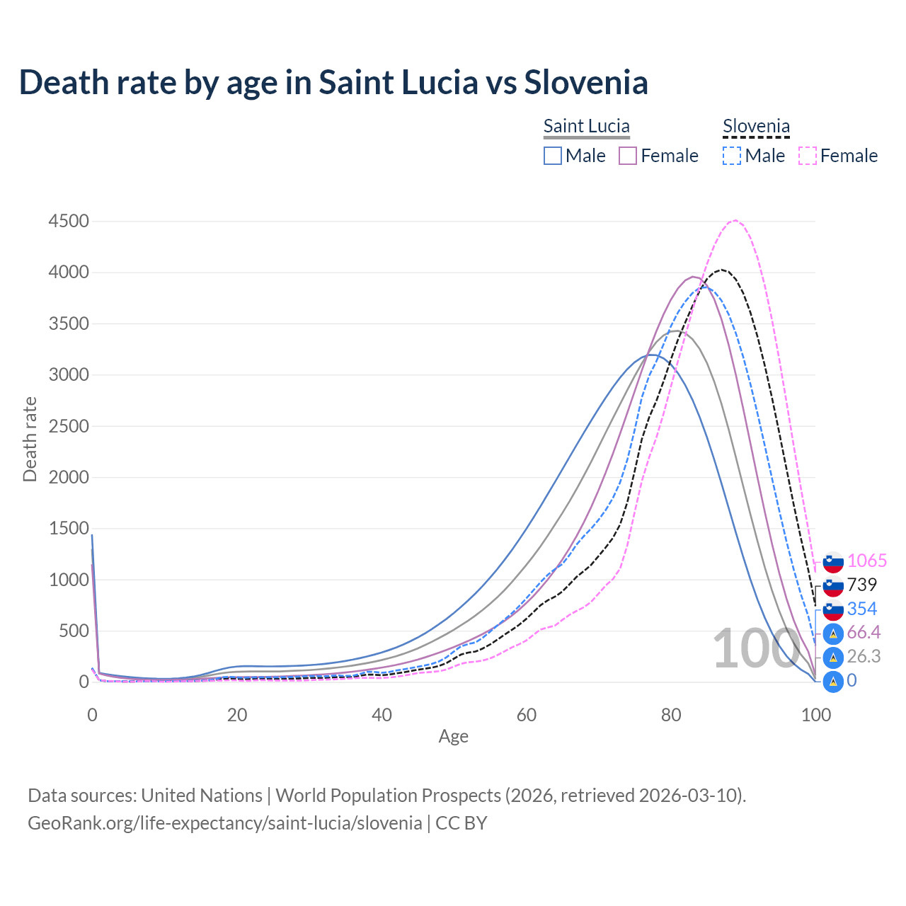 This life expectancy calculator shows the odds of living to 100, 95, 90, and below based on current age for both males and females in Saint Lucia and Slovenia, along with mean and median age of death. The calculations are based on the 2026 life tables (actuarial tables) from the UN World Population Prospects.