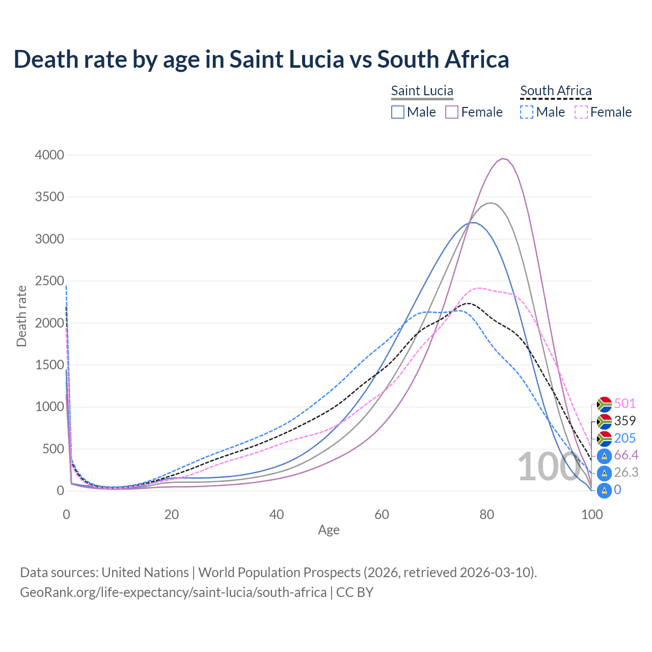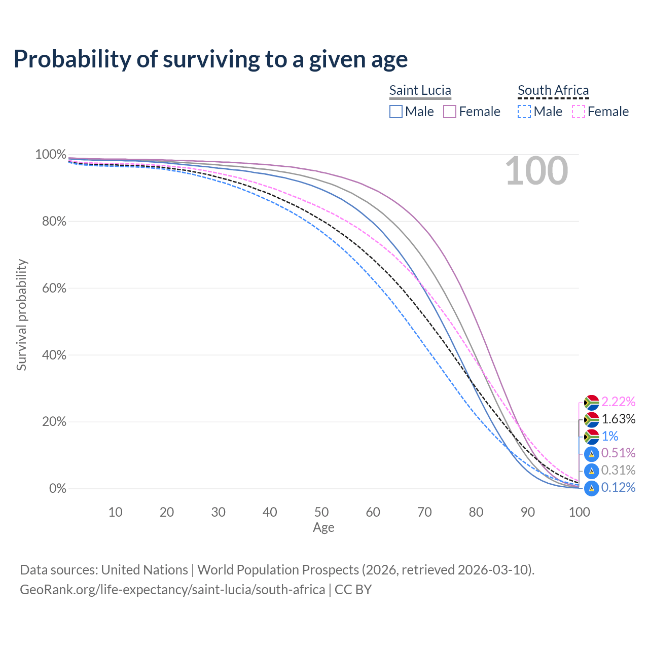 This life expectancy calculator shows the odds of living to 100, 95, 90, and below based on current age for both males and females in Saint Lucia and South Africa, along with mean and median age of death. The calculations are based on the 2026 life tables (actuarial tables) from the UN World Population Prospects.