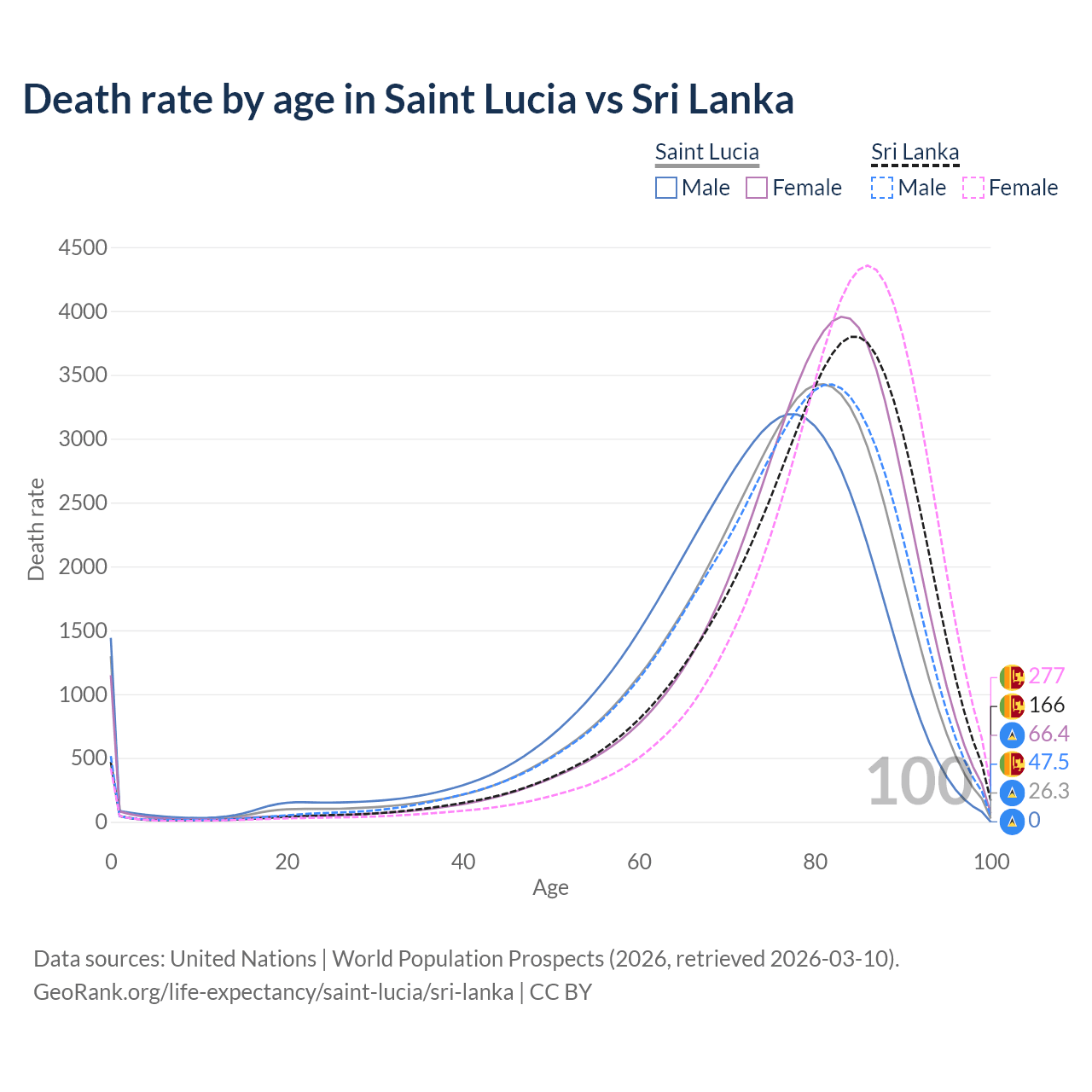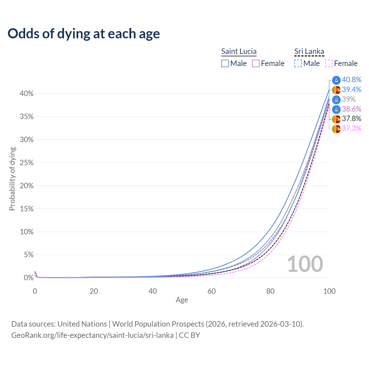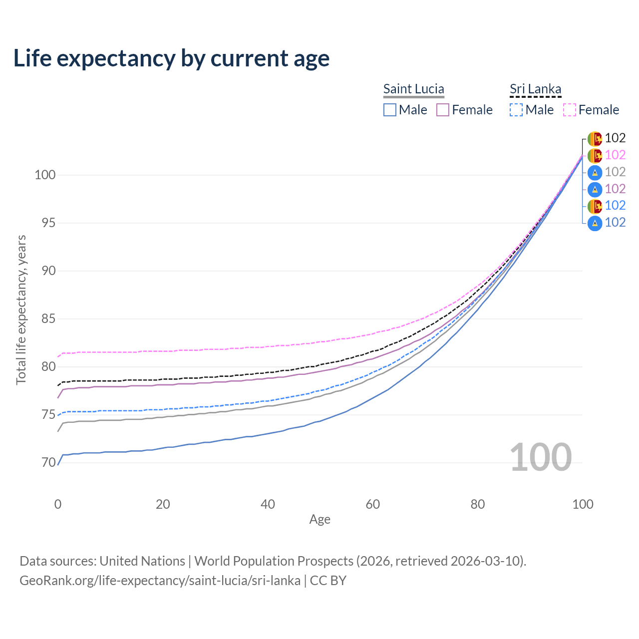 This life expectancy calculator shows the odds of living to 100, 95, 90, and below based on current age for both males and females in Saint Lucia and Sri Lanka, along with mean and median age of death. The calculations are based on the 2026 life tables (actuarial tables) from the UN World Population Prospects.