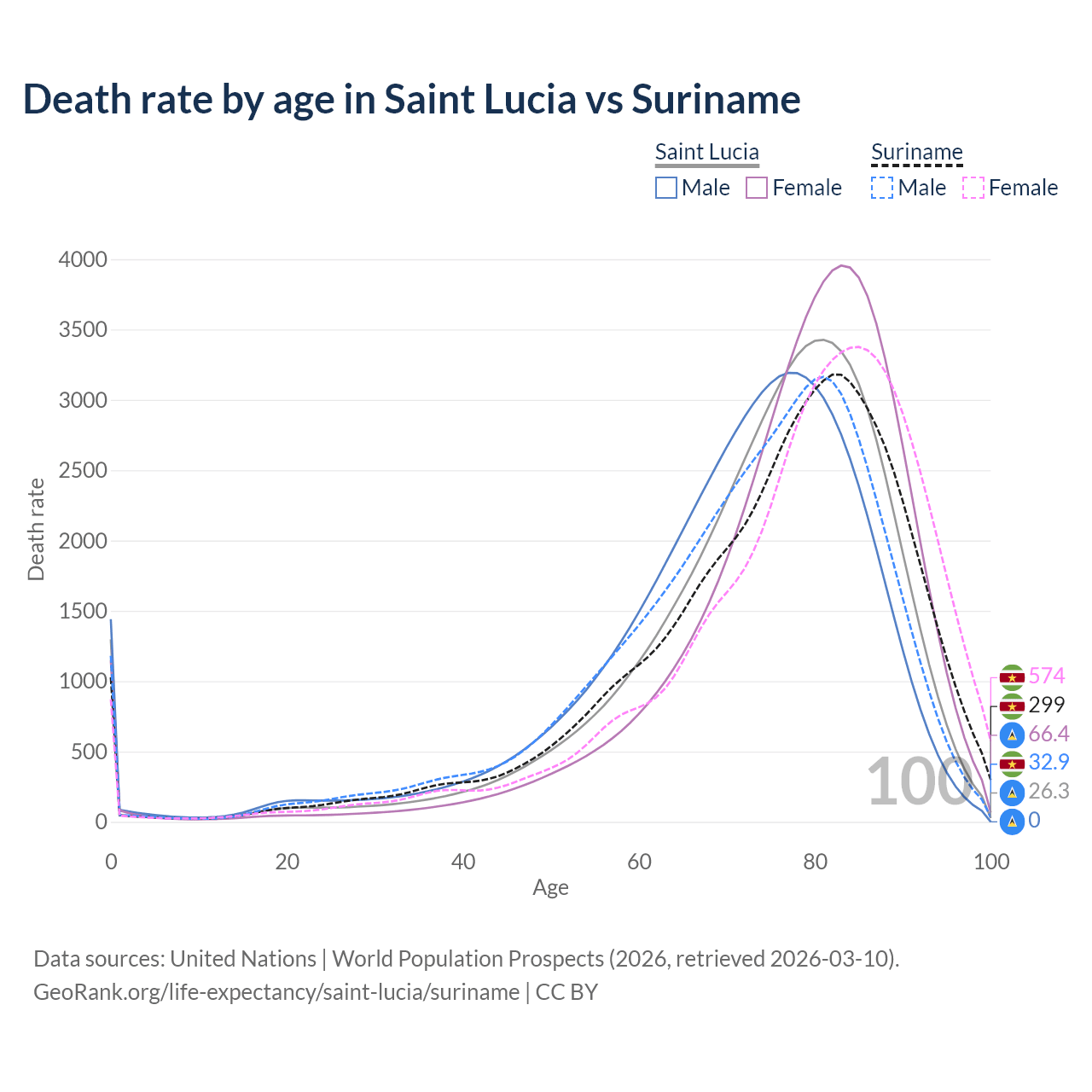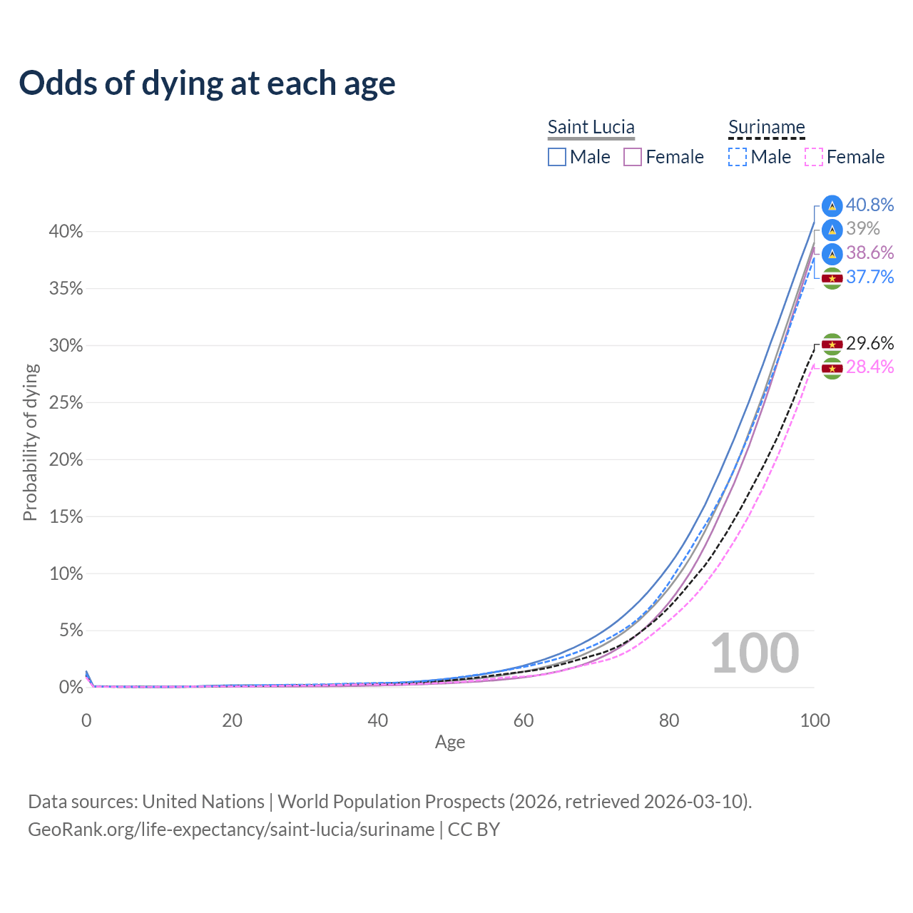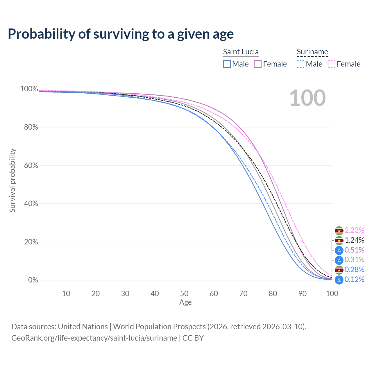 This life expectancy calculator shows the odds of living to 100, 95, 90, and below based on current age for both males and females in Saint Lucia and Suriname, along with mean and median age of death. The calculations are based on the 2026 life tables (actuarial tables) from the UN World Population Prospects.