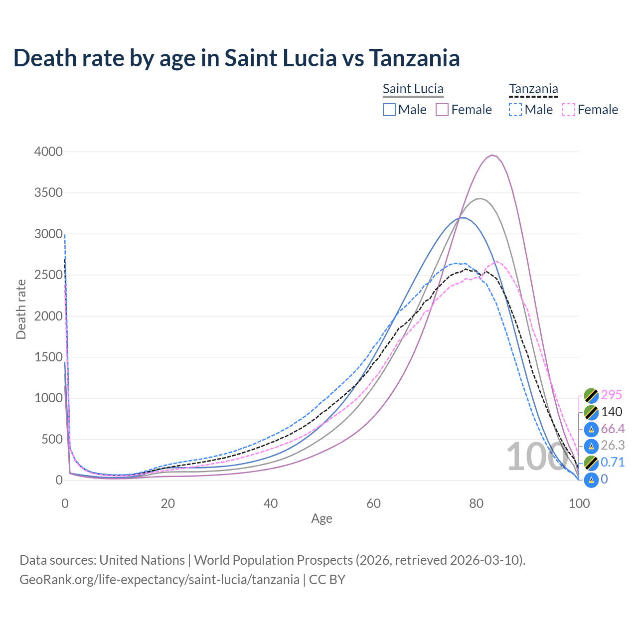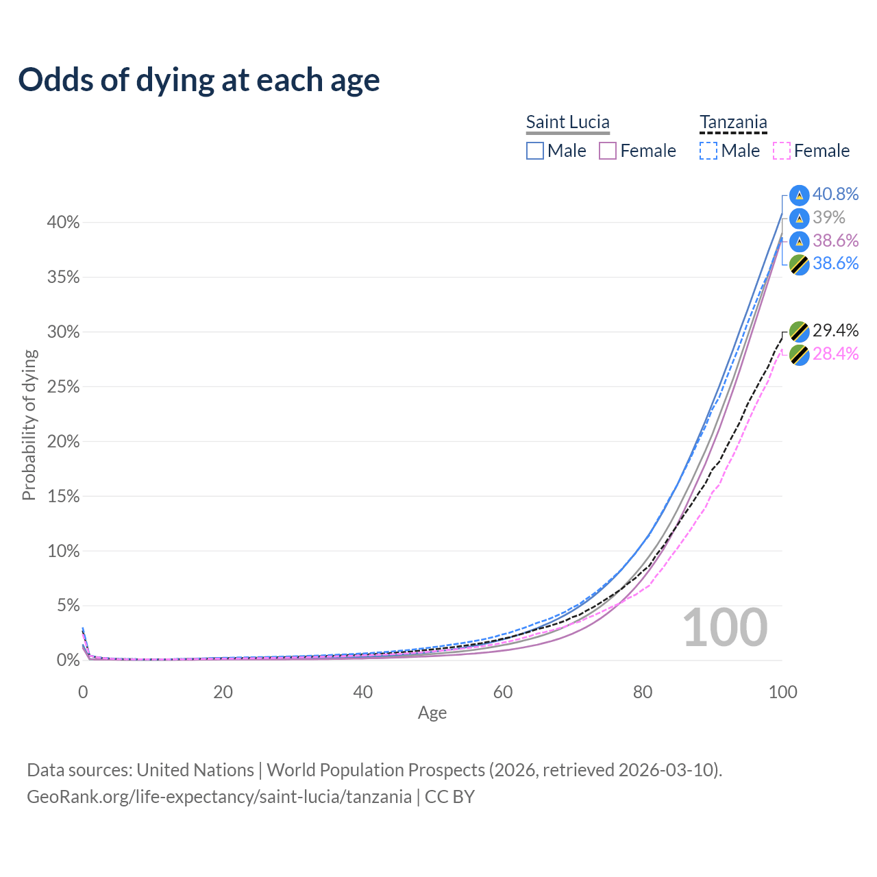 This life expectancy calculator shows the odds of living to 100, 95, 90, and below based on current age for both males and females in Saint Lucia and Tanzania, along with mean and median age of death. The calculations are based on the 2026 life tables (actuarial tables) from the UN World Population Prospects.