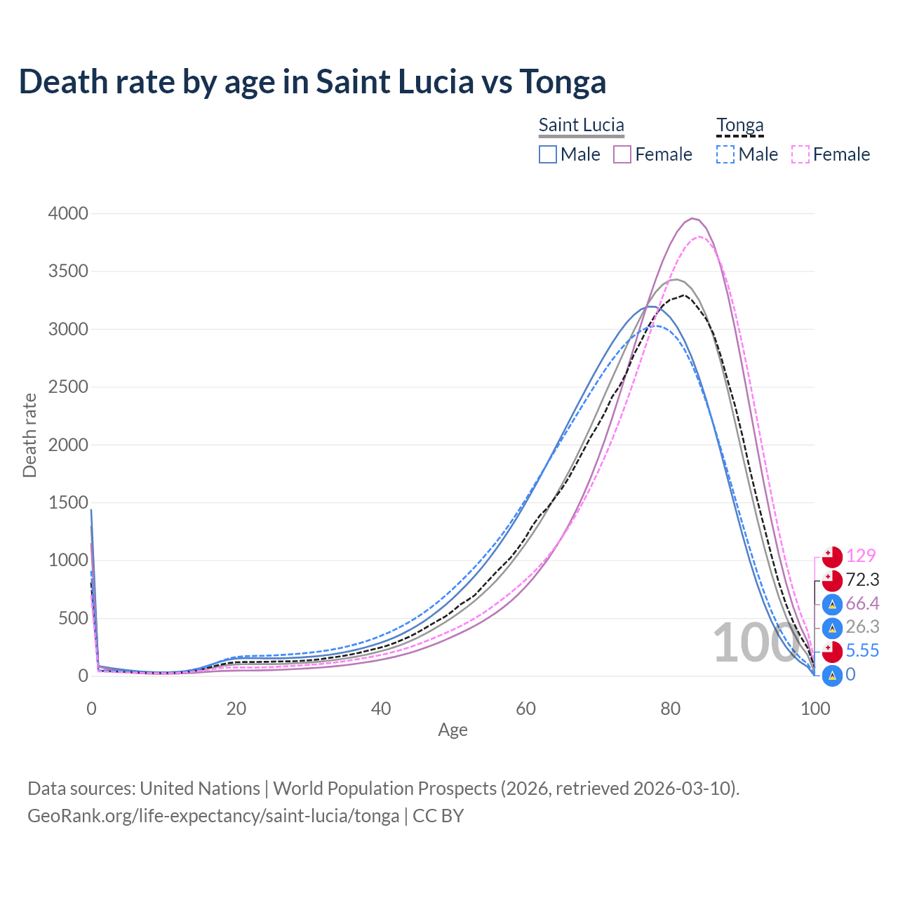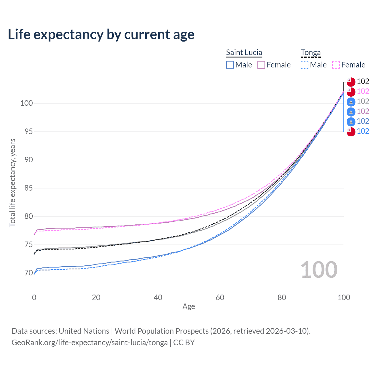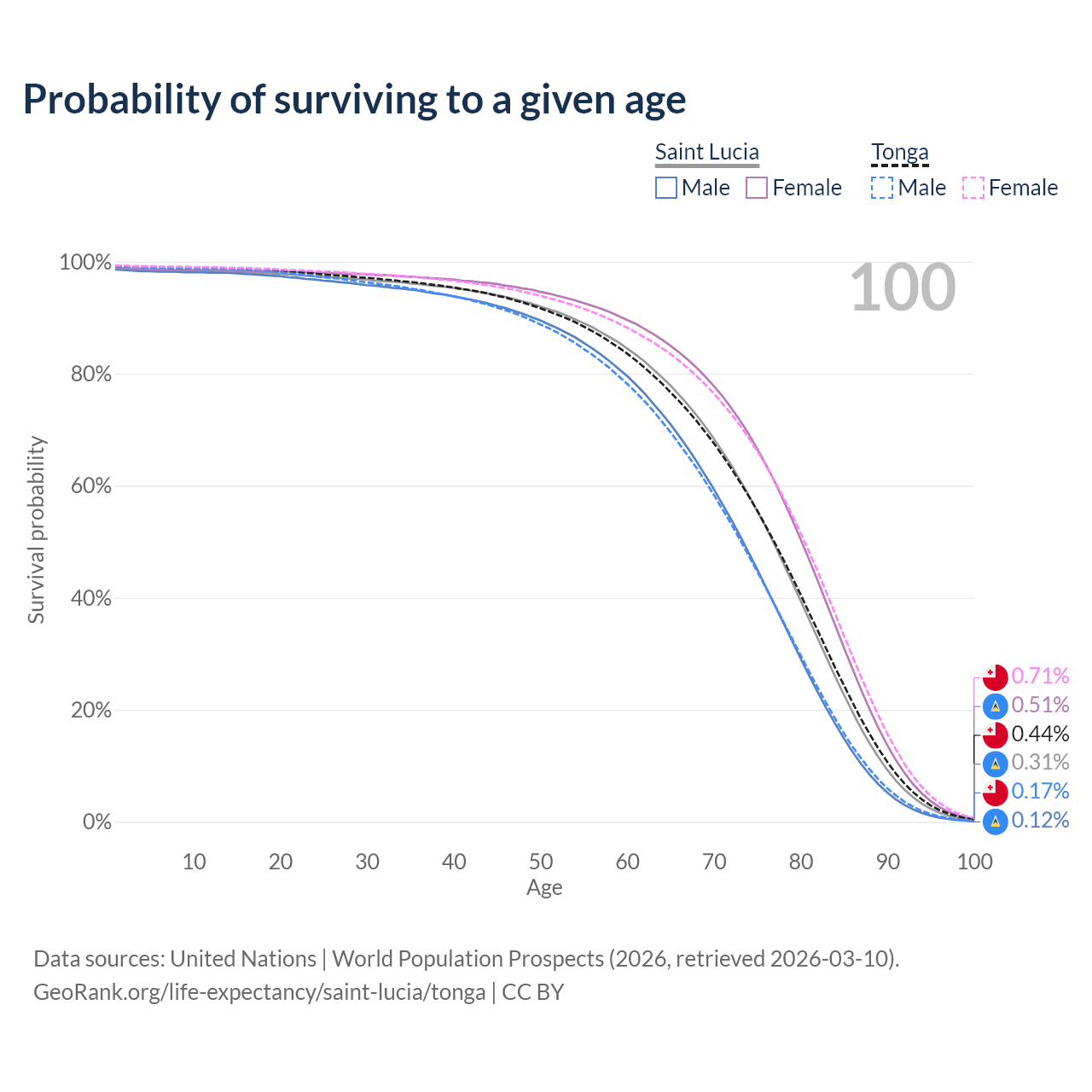 This life expectancy calculator shows the odds of living to 100, 95, 90, and below based on current age for both males and females in Saint Lucia and Tonga, along with mean and median age of death. The calculations are based on the 2026 life tables (actuarial tables) from the UN World Population Prospects.