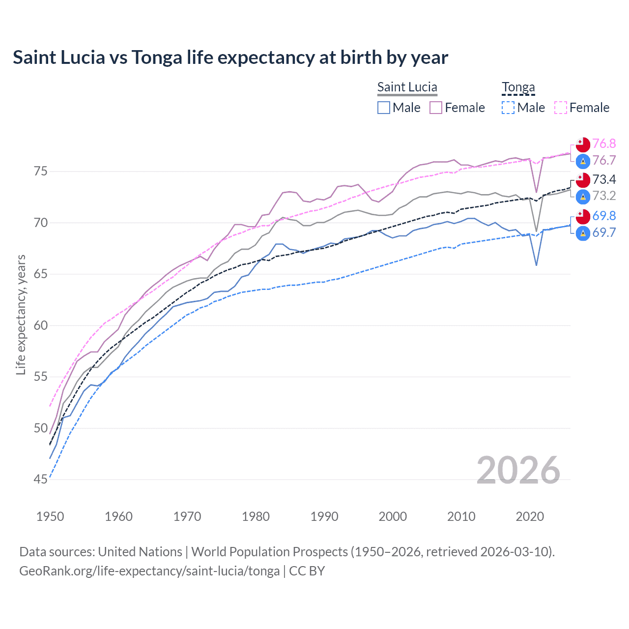 GeoRank.org/life-expectancy/saint-lucia/tonga | CC BY