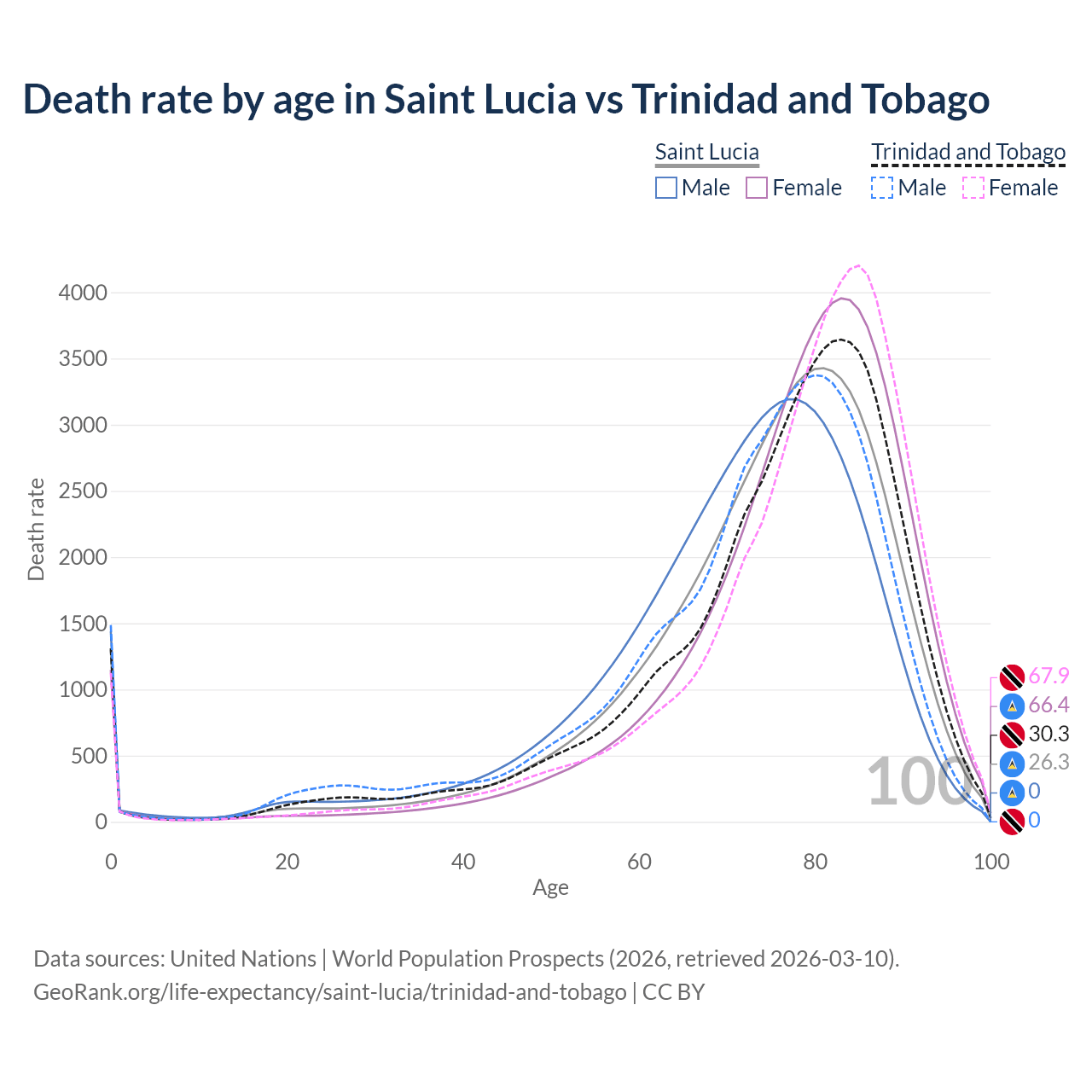 In Saint Lucia, the most common age of death is 81, compared to 83 in Trinidad and Tobago. The median age of death is 76.8 in Saint Lucia and 78.4 in Trinidad and Tobago, meaning only half of each cohort is expected to live past that age.
