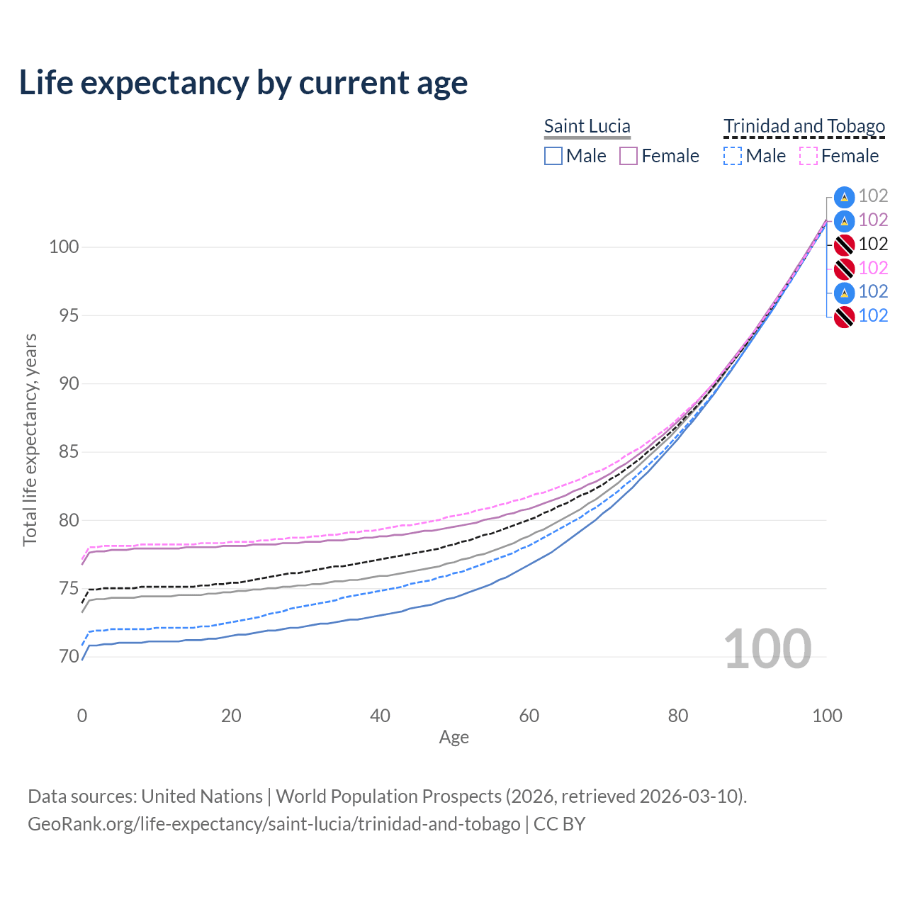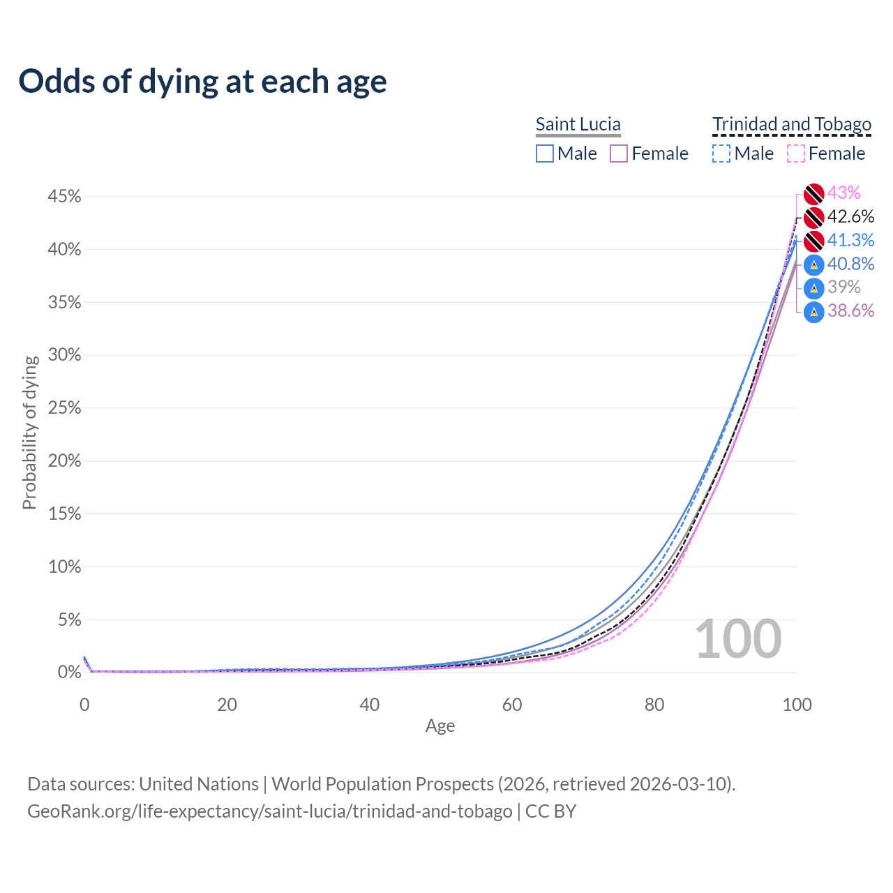 This life expectancy calculator shows the odds of living to 100, 95, 90, and below based on current age for both males and females in Saint Lucia and Trinidad and Tobago, along with mean and median age of death. The calculations are based on the 2026 life tables (actuarial tables) from the UN World Population Prospects.
