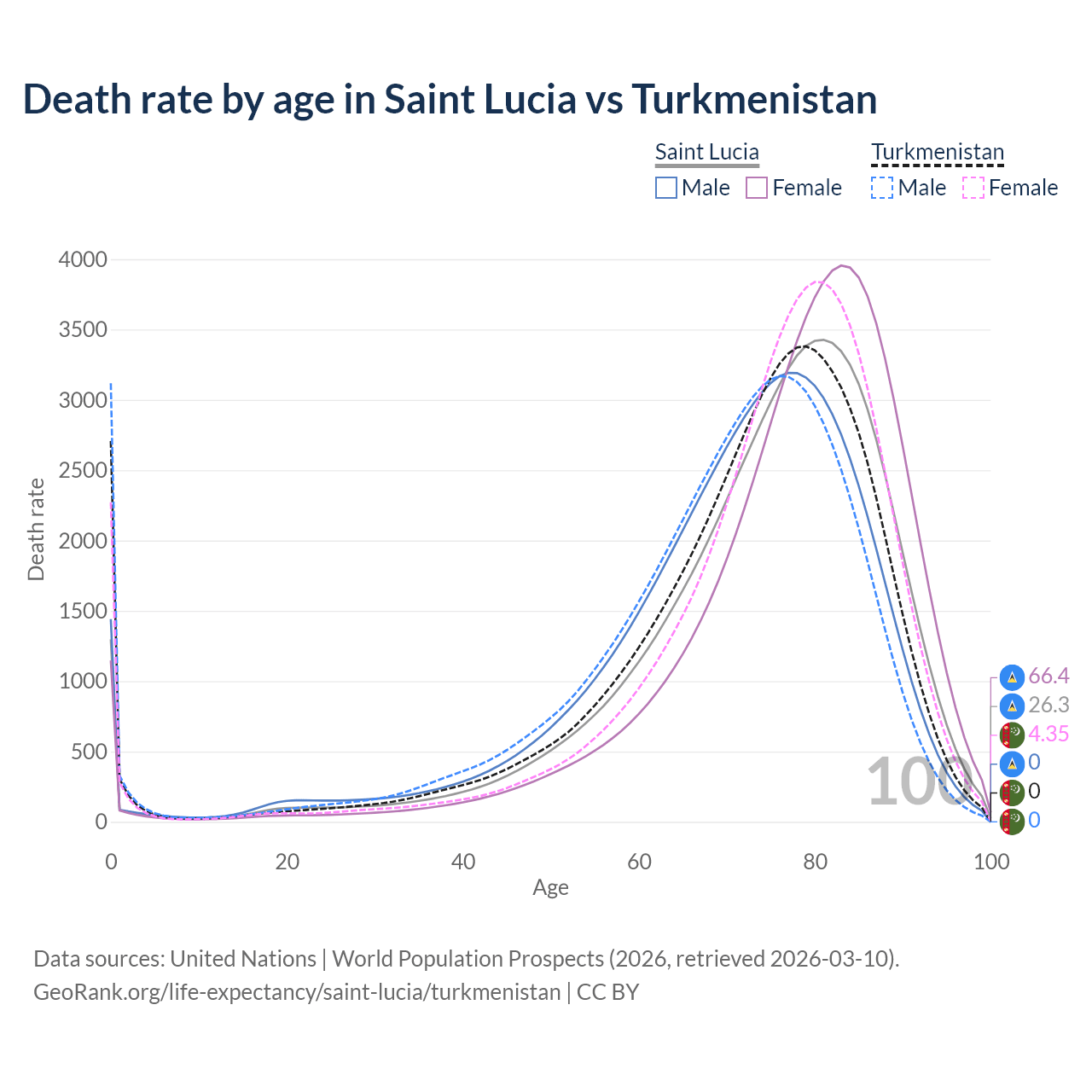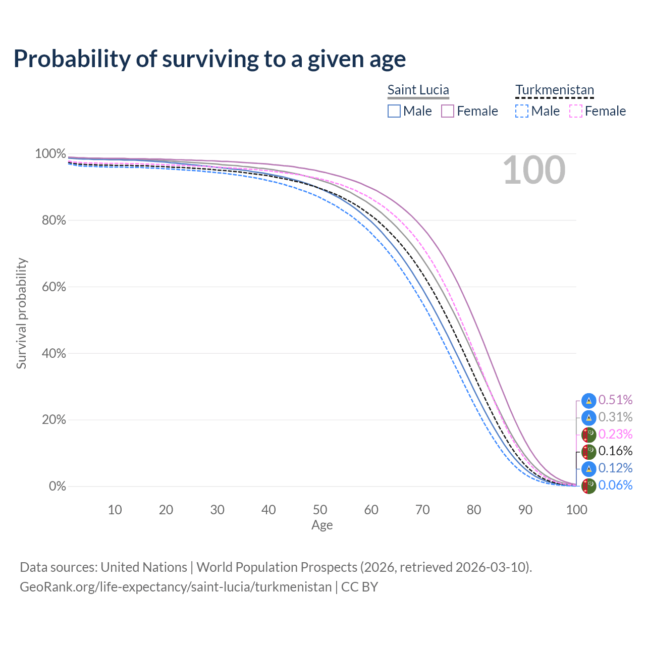 This life expectancy calculator shows the odds of living to 100, 95, 90, and below based on current age for both males and females in Saint Lucia and Turkmenistan, along with mean and median age of death. The calculations are based on the 2026 life tables (actuarial tables) from the UN World Population Prospects.