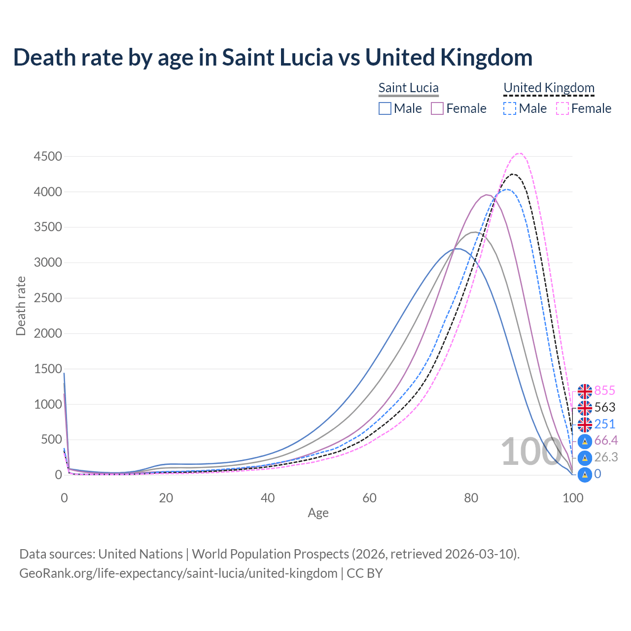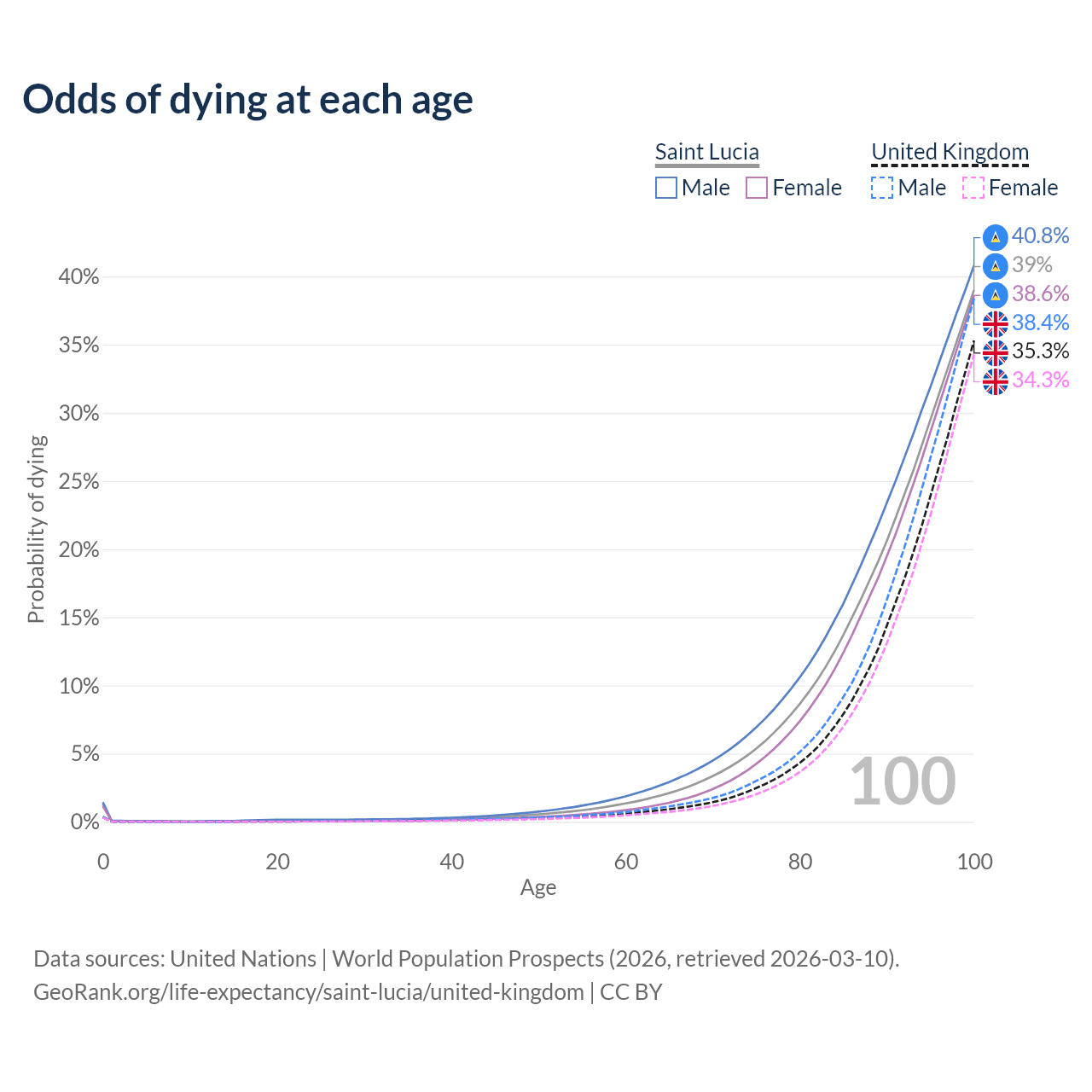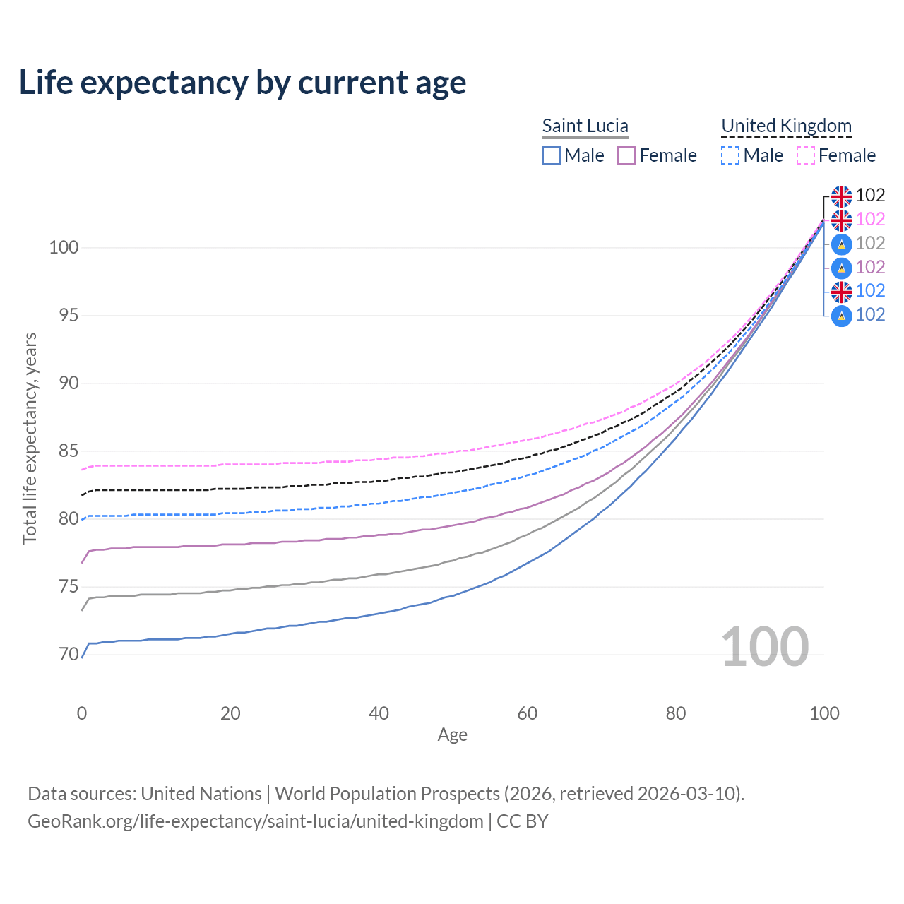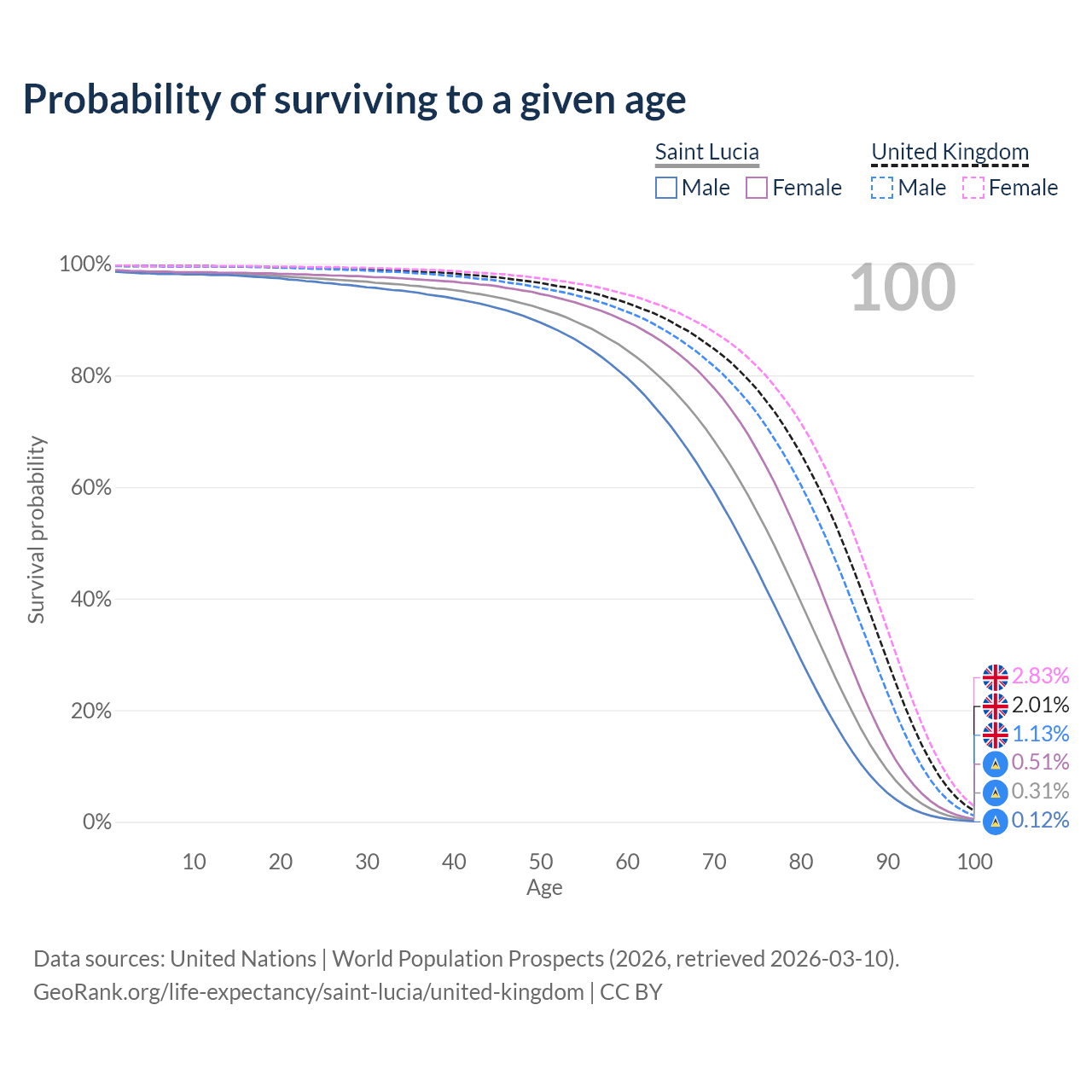 This life expectancy calculator shows the odds of living to 100, 95, 90, and below based on current age for both males and females in Saint Lucia and the United Kingdom, along with mean and median age of death. The calculations are based on the 2026 life tables (actuarial tables) from the UN World Population Prospects.