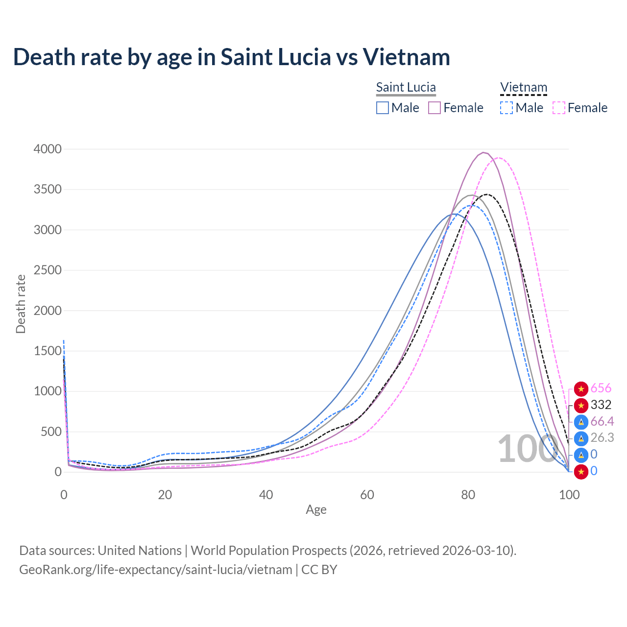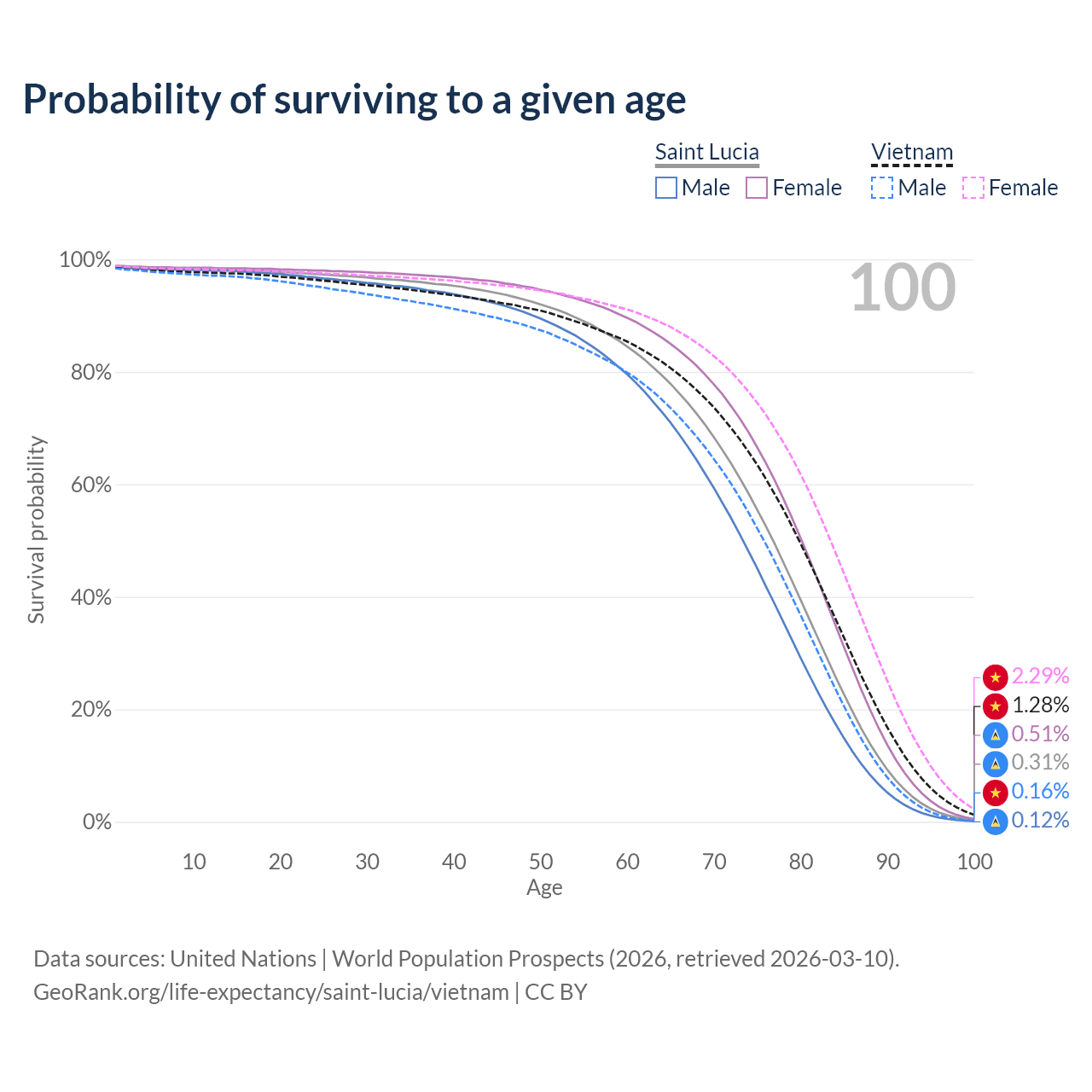This life expectancy calculator shows the odds of living to 100, 95, 90, and below based on current age for both males and females in Saint Lucia and Vietnam, along with mean and median age of death. The calculations are based on the 2026 life tables (actuarial tables) from the UN World Population Prospects.