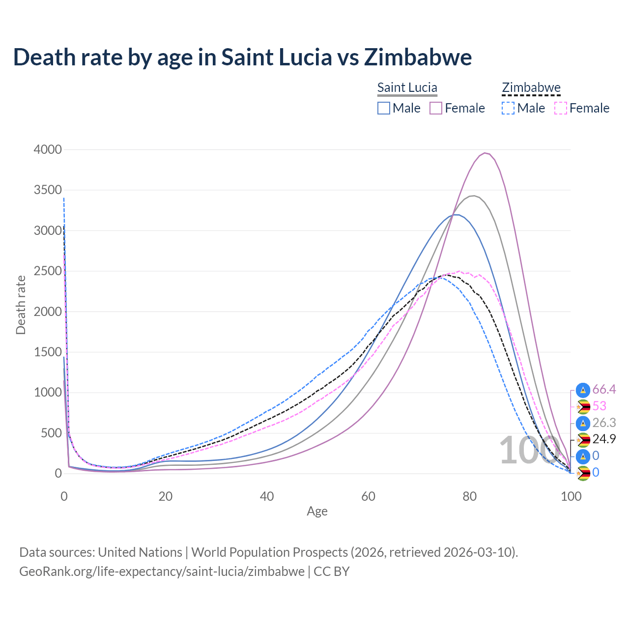 In Saint Lucia, the most common age of death is 81, compared to 0 in Zimbabwe. The median age of death is 76.8 in Saint Lucia and 68.8 in Zimbabwe, meaning only half of each cohort is expected to live past that age.