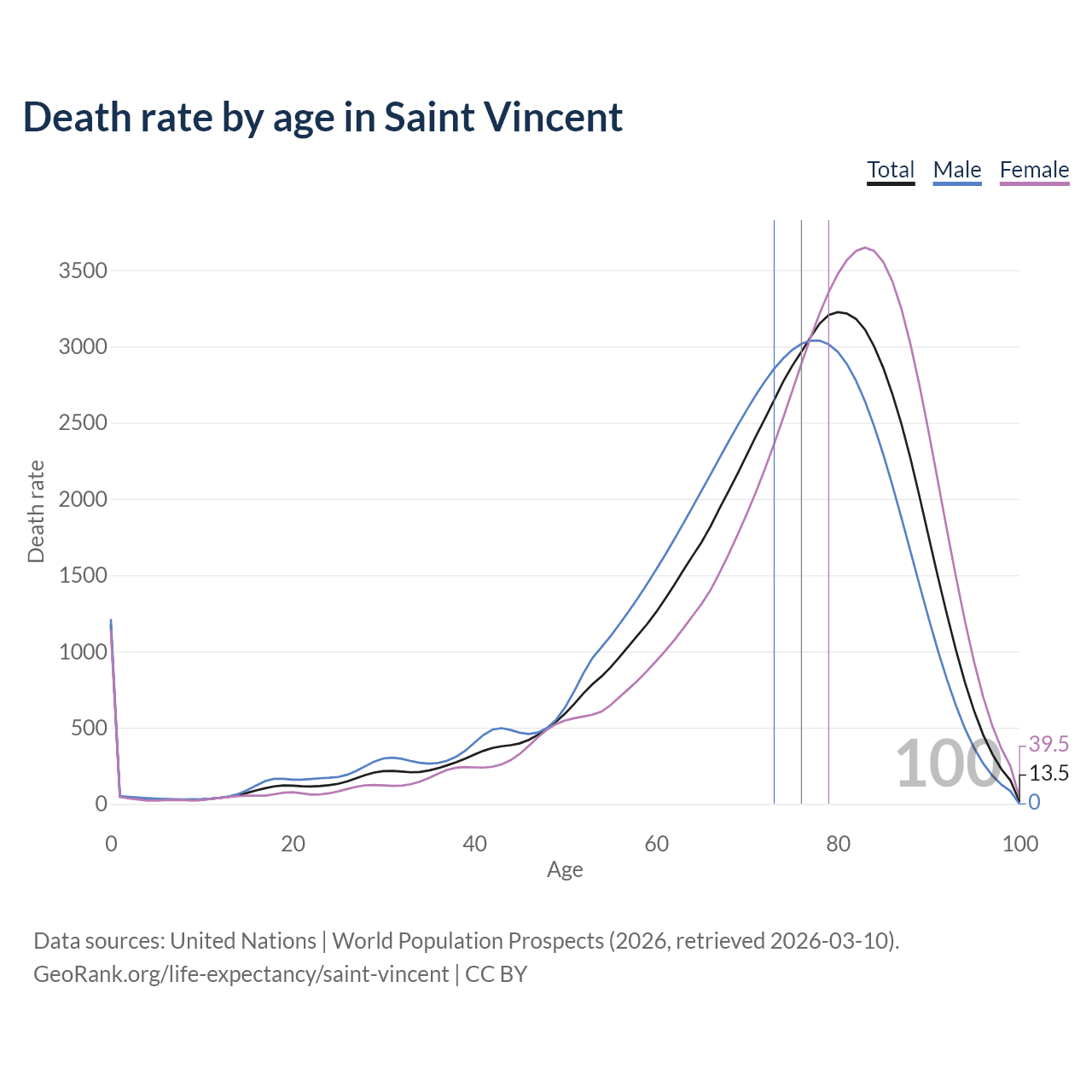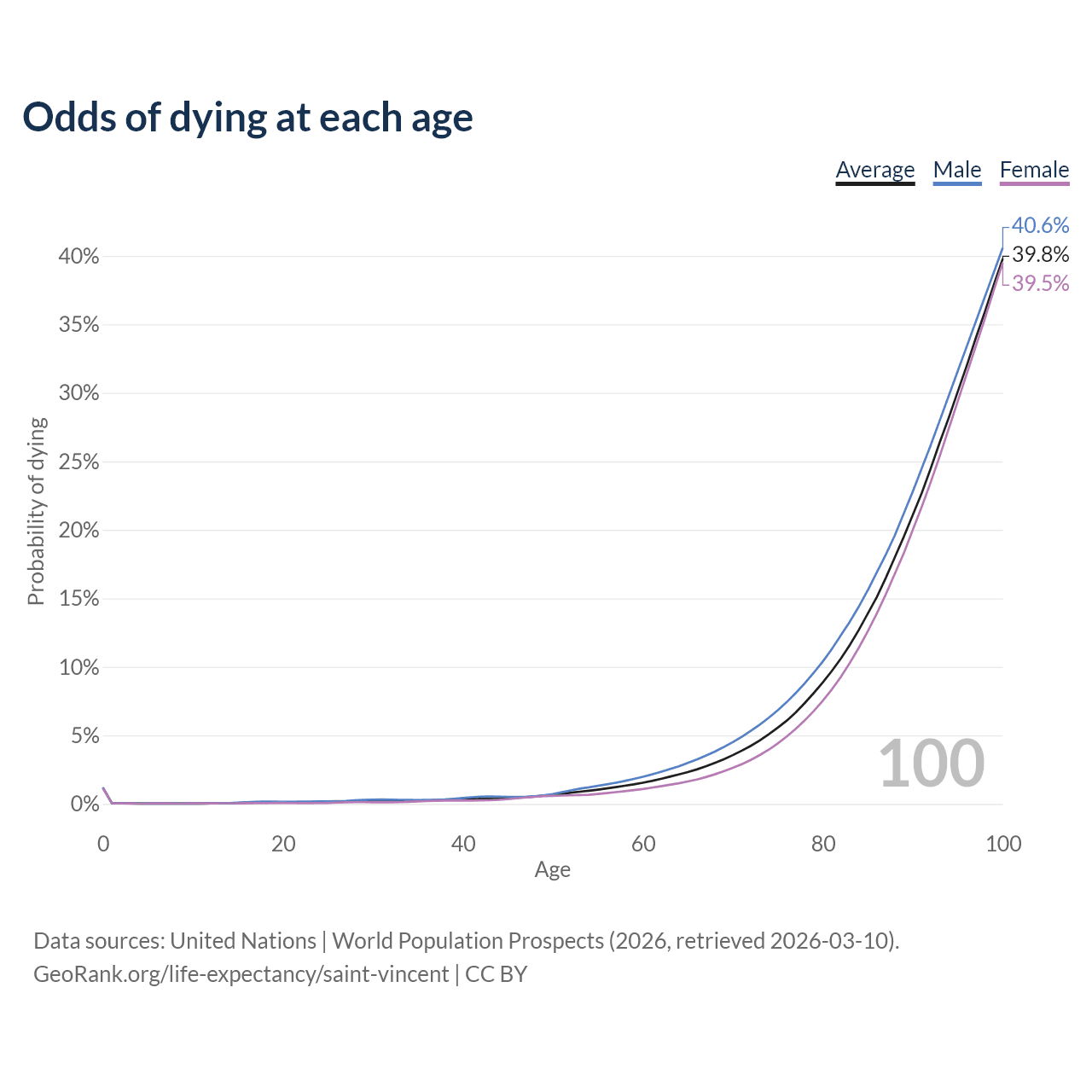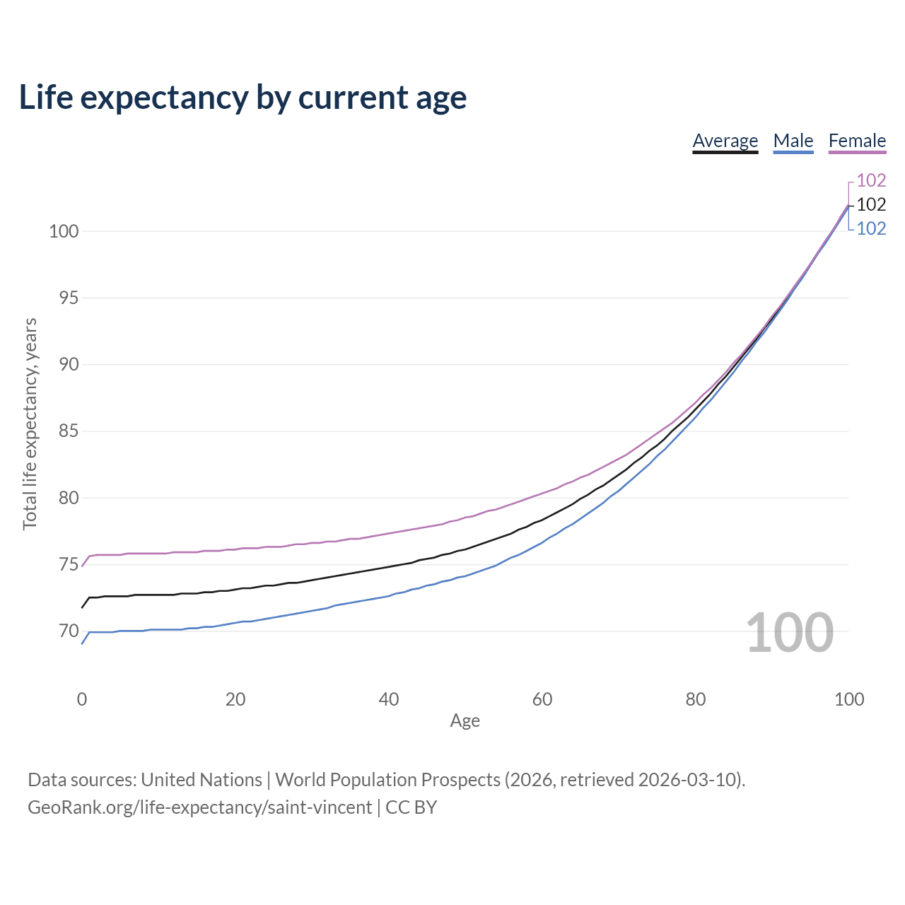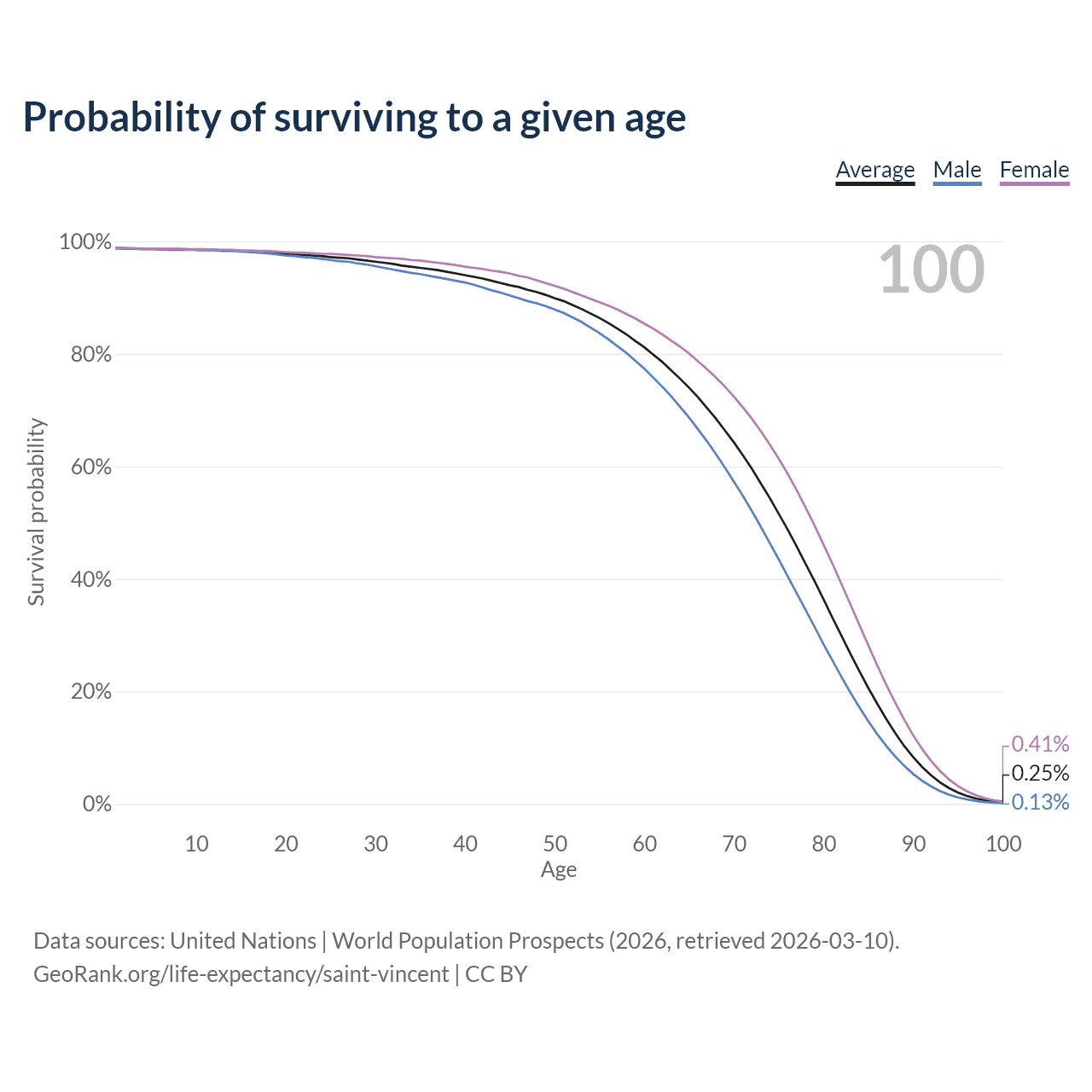 This life expectancy calculator shows the odds of living to 100, 95, 90, and below based on current age for both males and females in Saint Vincent, along with mean and median age of death. The calculations are based on the 2026 life tables (actuarial tables) from the UN World Population Prospects.