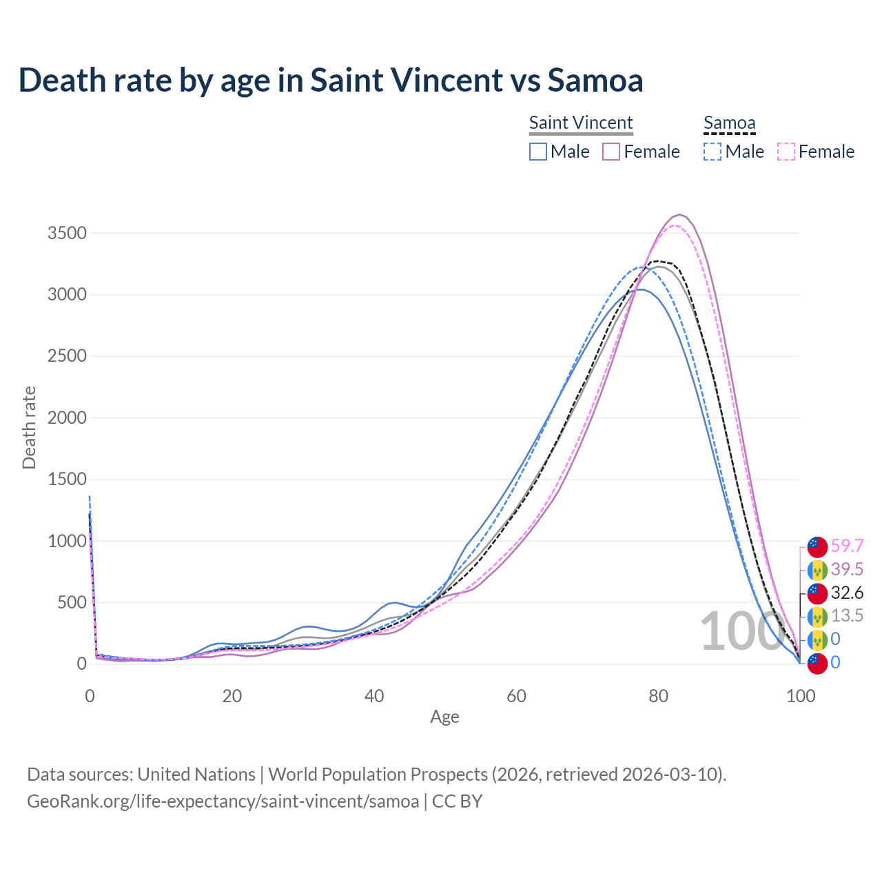 In Saint Vincent, the most common age of death is 80, compared to 80 in Samoa. The median age of death is 75.6 in Saint Vincent and 75.9 in Samoa, meaning only half of each cohort is expected to live past that age.