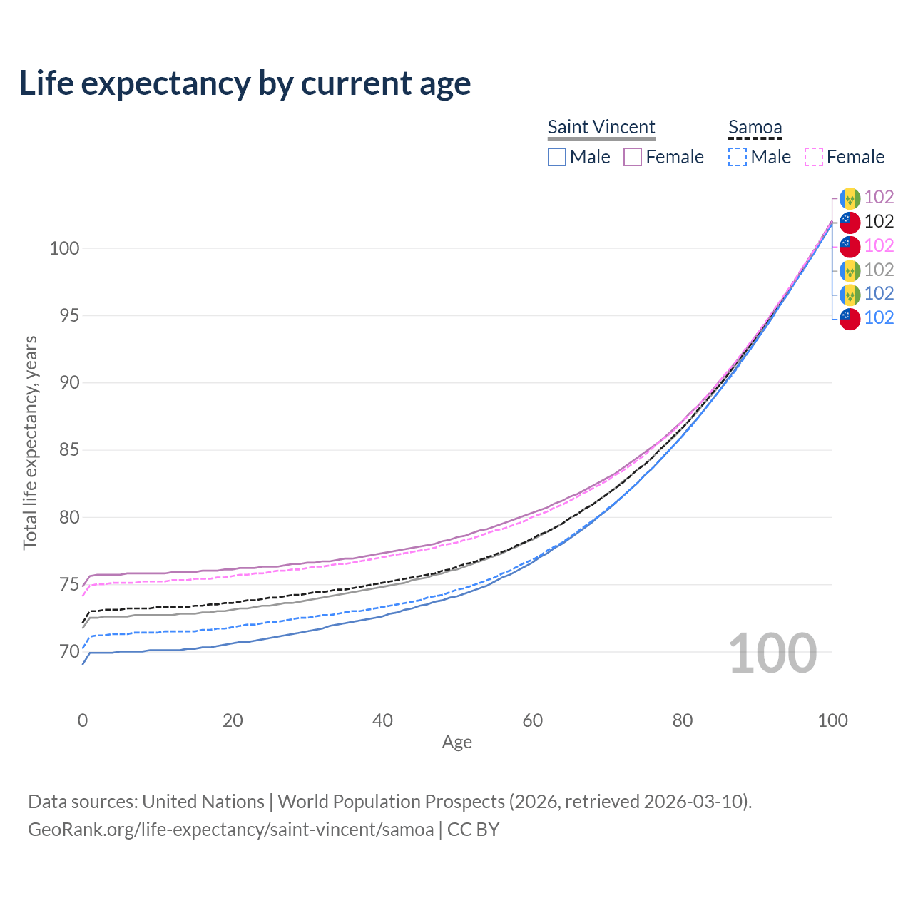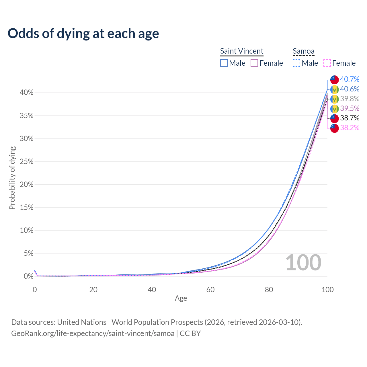 This life expectancy calculator shows the odds of living to 100, 95, 90, and below based on current age for both males and females in Saint Vincent and Samoa, along with mean and median age of death. The calculations are based on the 2026 life tables (actuarial tables) from the UN World Population Prospects.
