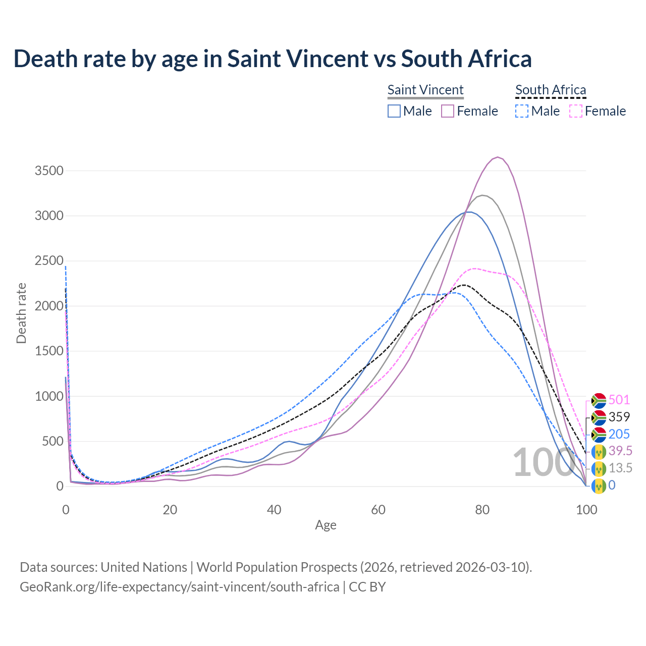 In Saint Vincent, the most common age of death is 80, compared to 77 in South Africa. The median age of death is 75.6 in Saint Vincent and 70.8 in South Africa, meaning only half of each cohort is expected to live past that age.