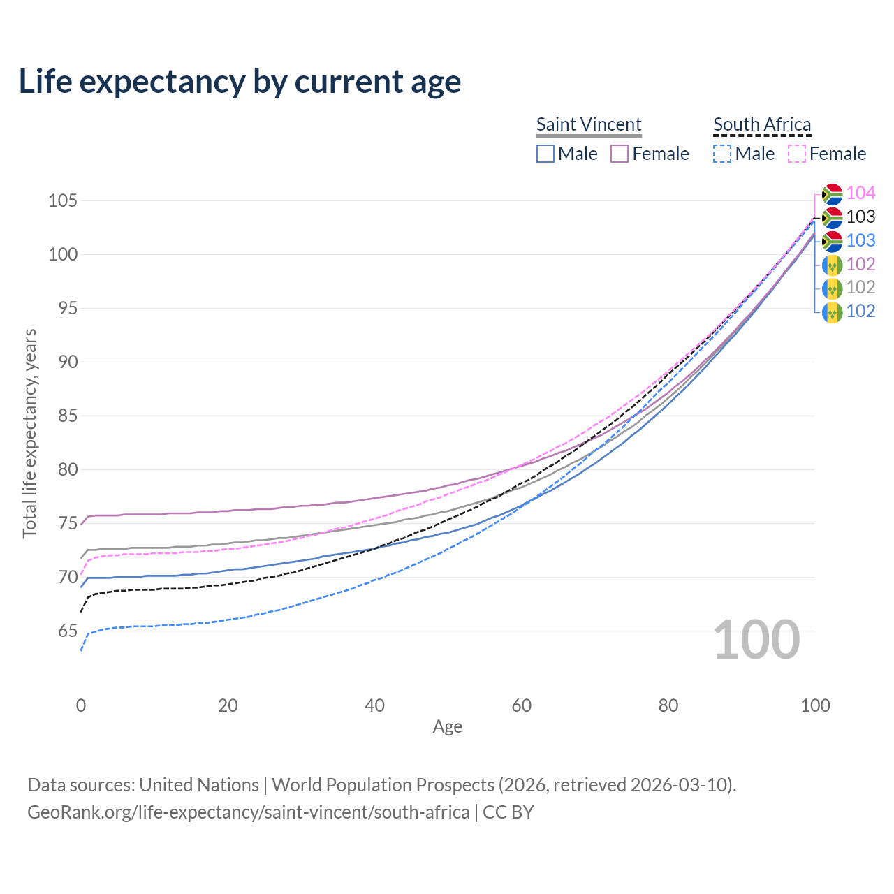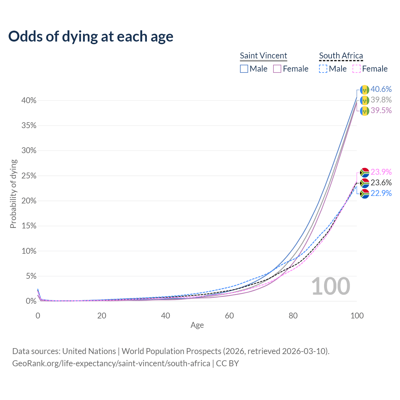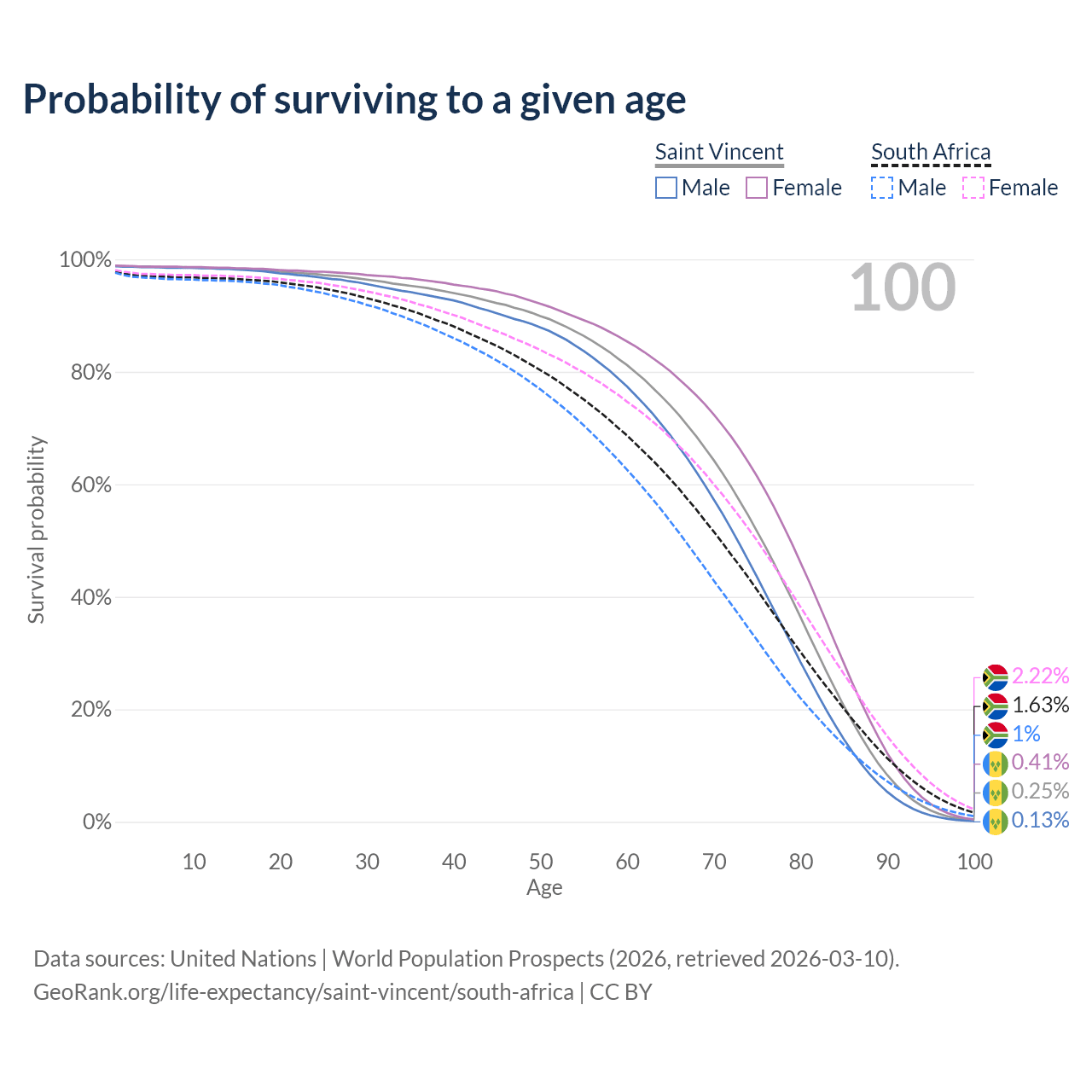 This life expectancy calculator shows the odds of living to 100, 95, 90, and below based on current age for both males and females in Saint Vincent and South Africa, along with mean and median age of death. The calculations are based on the 2026 life tables (actuarial tables) from the UN World Population Prospects.