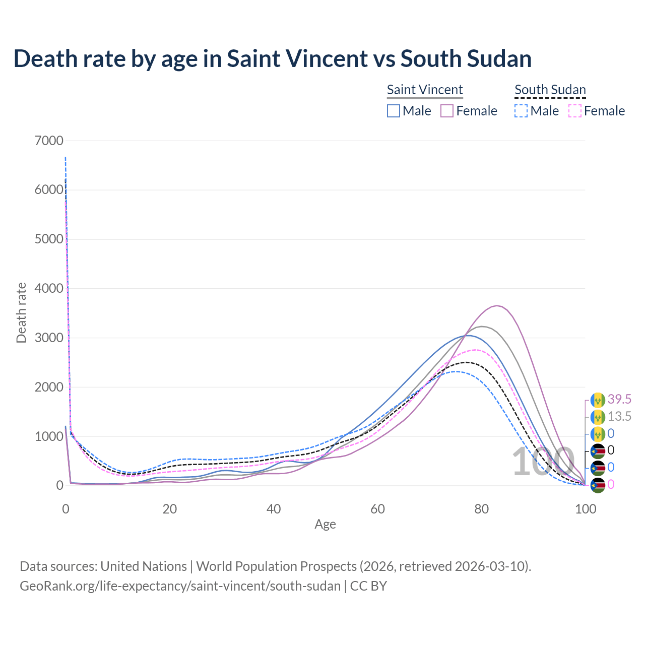 In Saint Vincent, the most common age of death is 80, compared to 0 in South Sudan. The median age of death is 75.6 in Saint Vincent and 67.5 in South Sudan, meaning only half of each cohort is expected to live past that age.