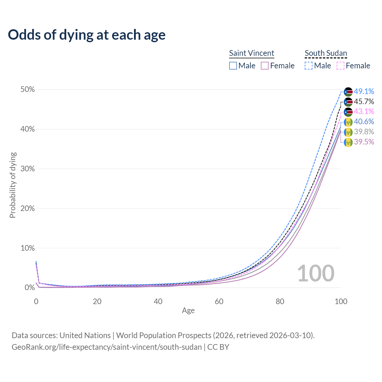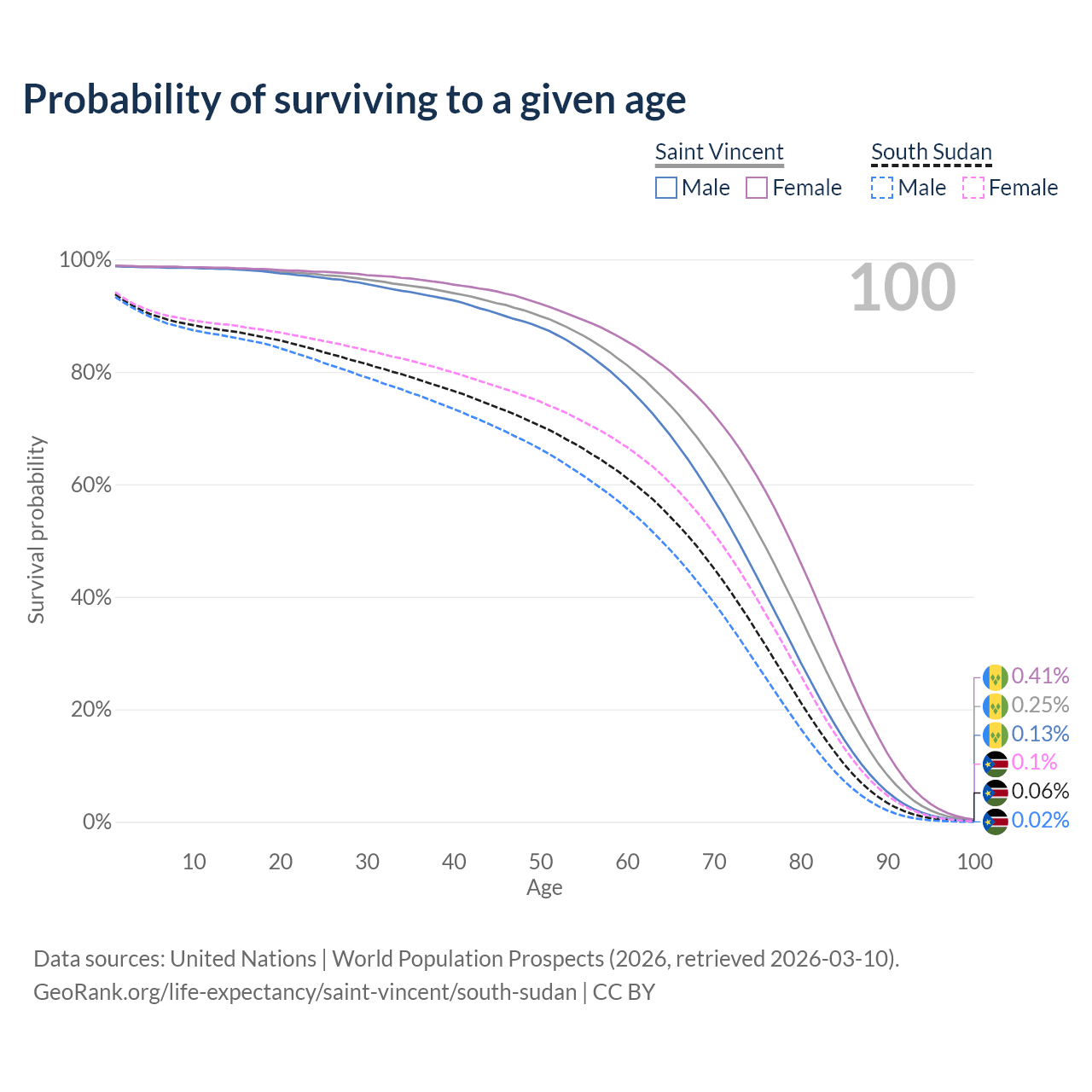 This life expectancy calculator shows the odds of living to 100, 95, 90, and below based on current age for both males and females in Saint Vincent and South Sudan, along with mean and median age of death. The calculations are based on the 2026 life tables (actuarial tables) from the UN World Population Prospects.