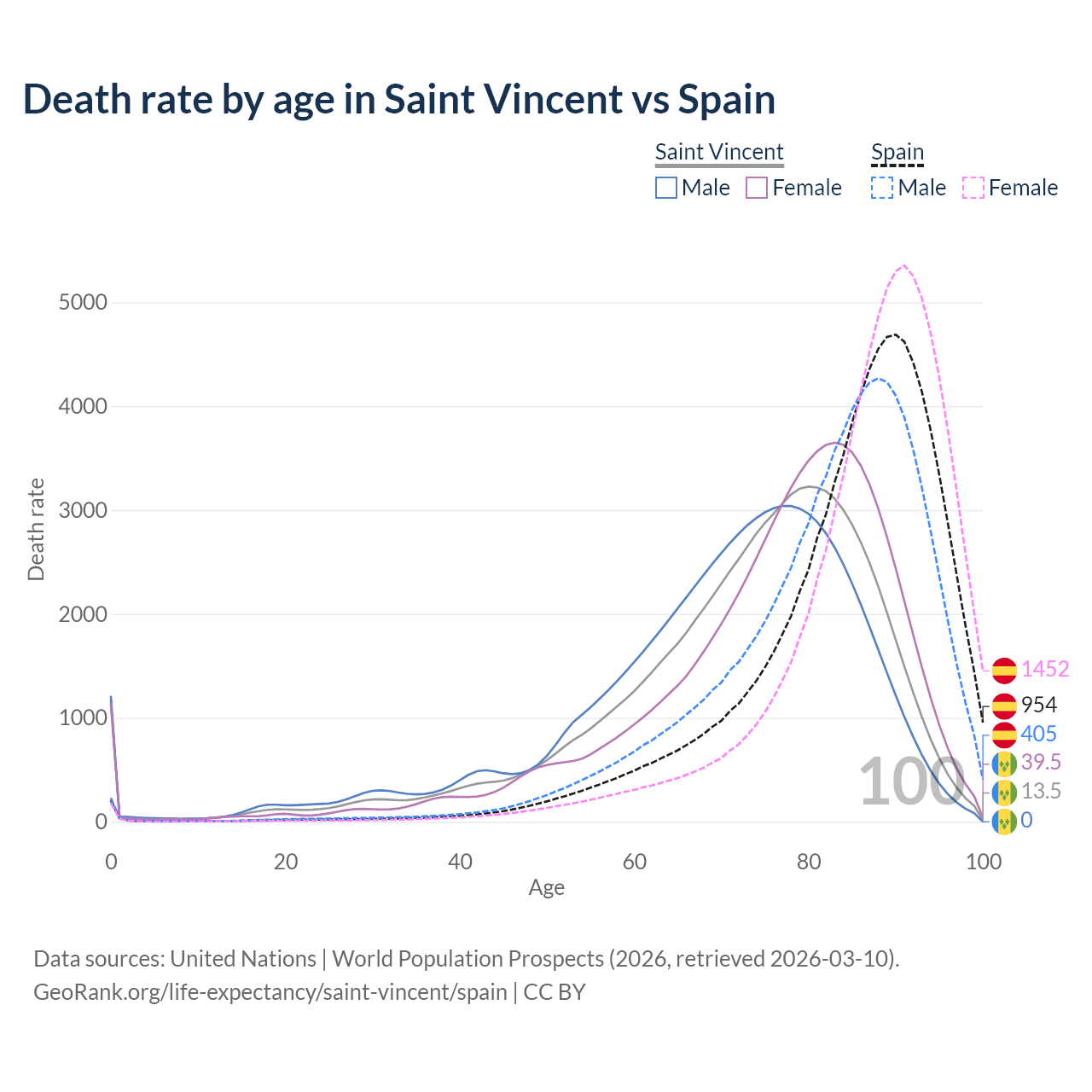 In Saint Vincent, the most common age of death is 80, compared to 90 in Spain. The median age of death is 75.6 in Saint Vincent and 87 in Spain, meaning only half of each cohort is expected to live past that age.