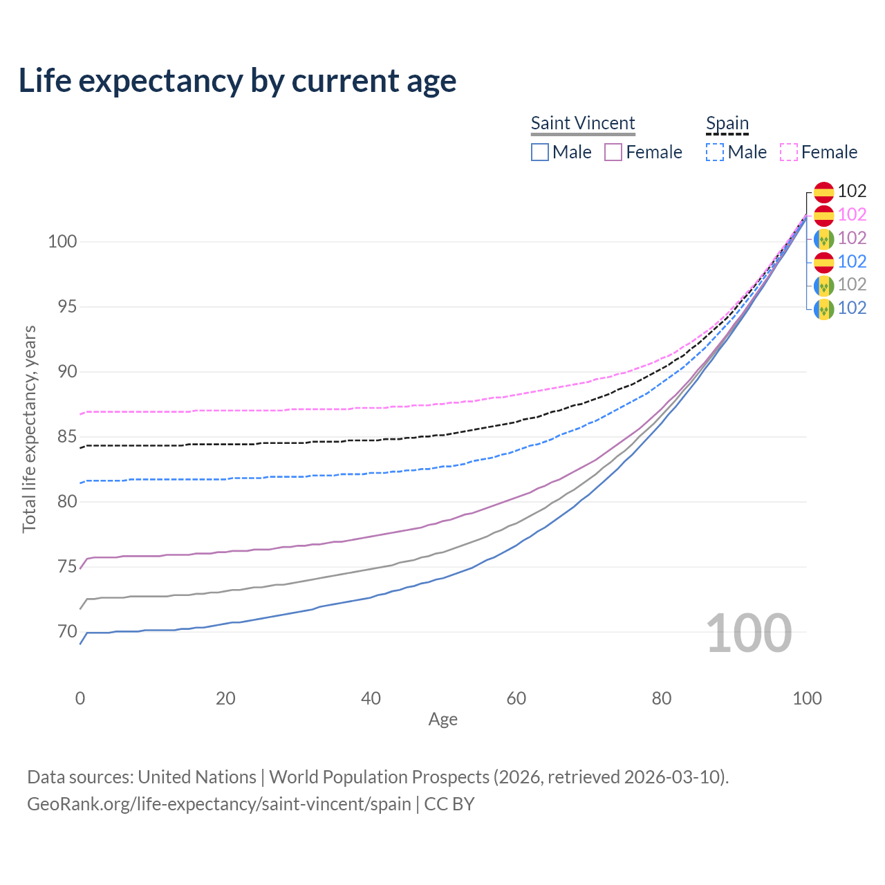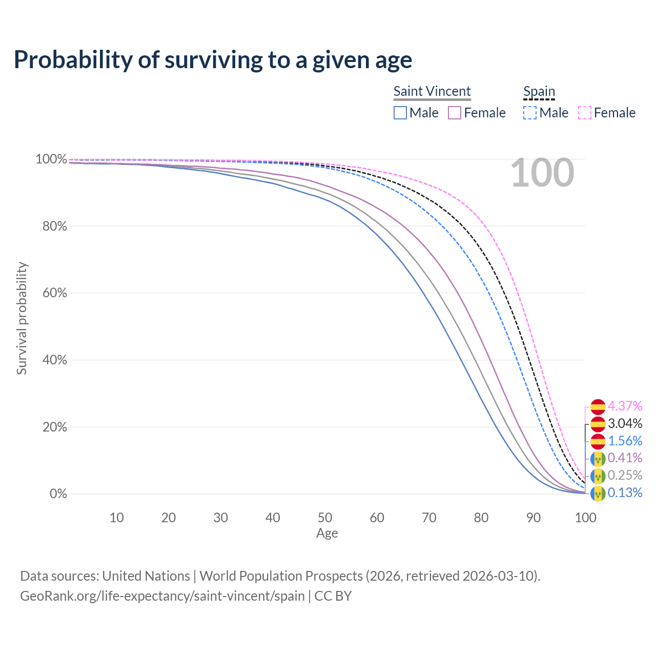 This life expectancy calculator shows the odds of living to 100, 95, 90, and below based on current age for both males and females in Saint Vincent and Spain, along with mean and median age of death. The calculations are based on the 2026 life tables (actuarial tables) from the UN World Population Prospects.