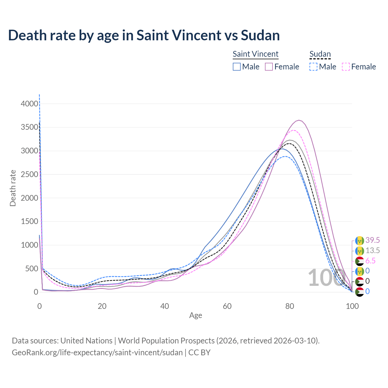 In Saint Vincent, the most common age of death is 80, compared to 0 in Sudan. The median age of death is 75.6 in Saint Vincent and 74.1 in Sudan, meaning only half of each cohort is expected to live past that age.