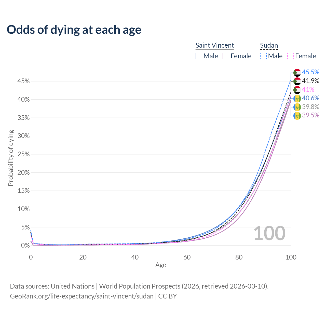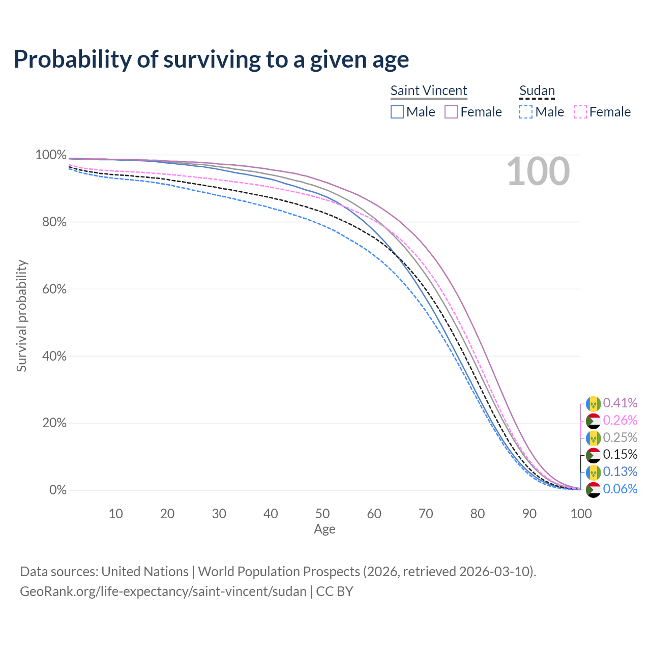 This life expectancy calculator shows the odds of living to 100, 95, 90, and below based on current age for both males and females in Saint Vincent and Sudan, along with mean and median age of death. The calculations are based on the 2026 life tables (actuarial tables) from the UN World Population Prospects.