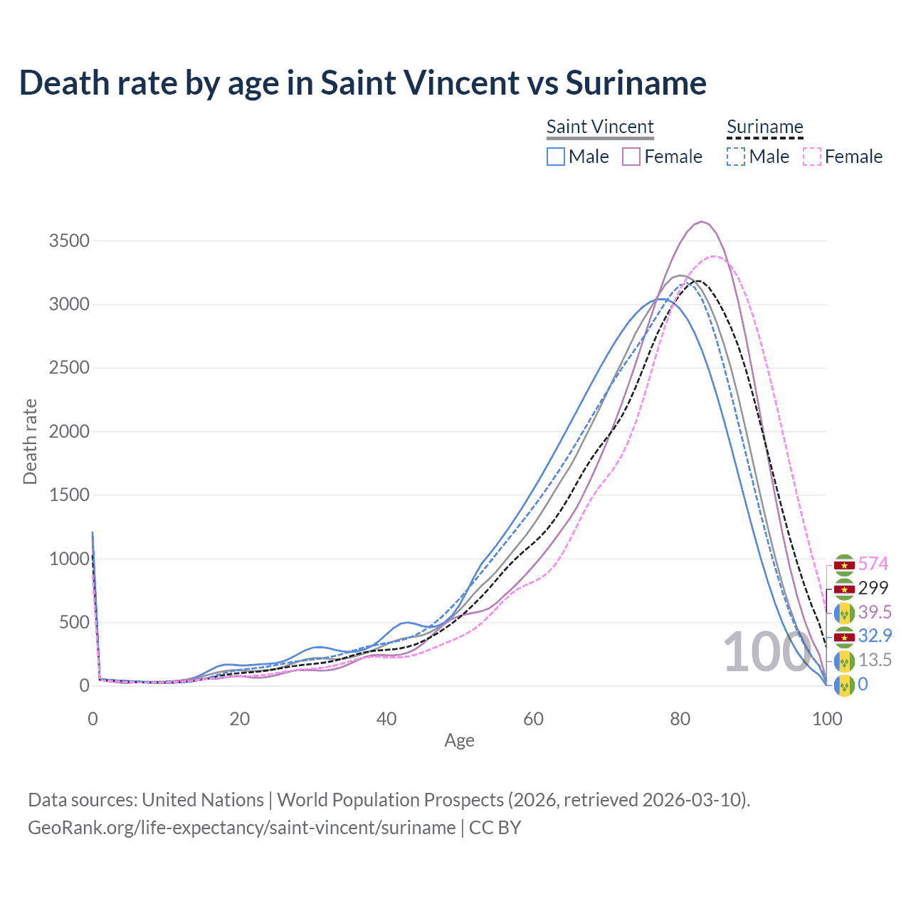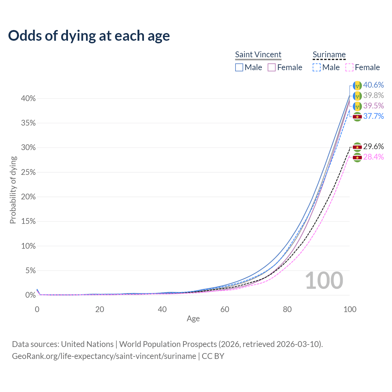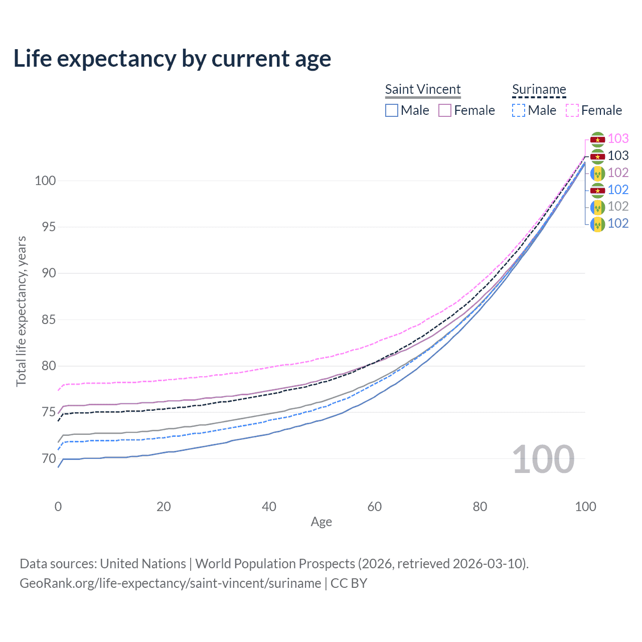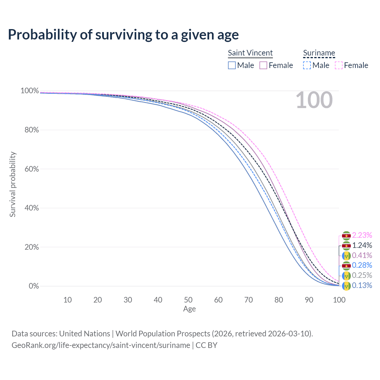 This life expectancy calculator shows the odds of living to 100, 95, 90, and below based on current age for both males and females in Saint Vincent and Suriname, along with mean and median age of death. The calculations are based on the 2026 life tables (actuarial tables) from the UN World Population Prospects.
