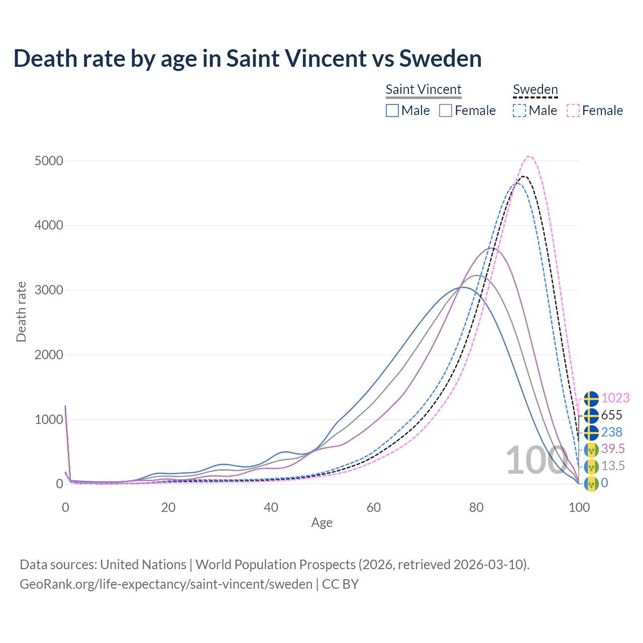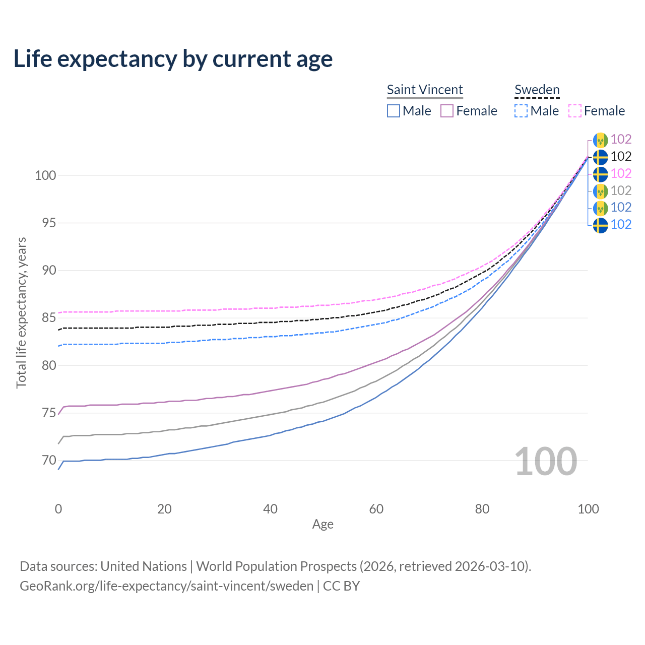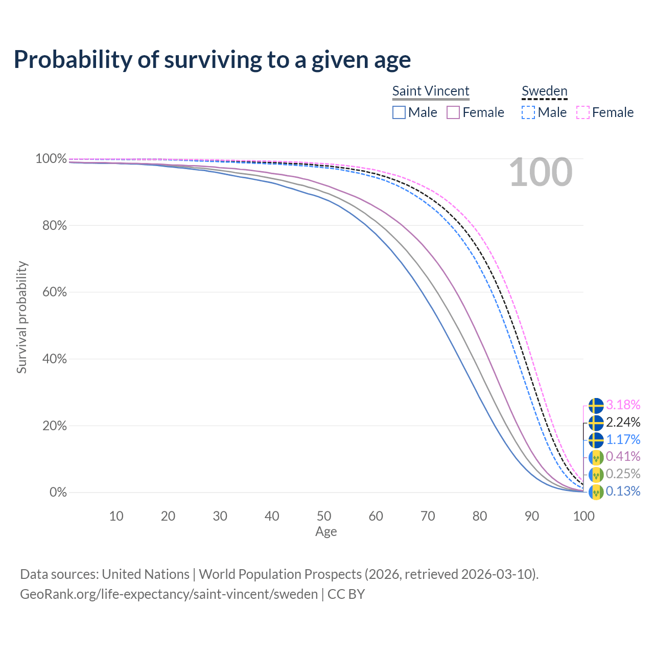 This life expectancy calculator shows the odds of living to 100, 95, 90, and below based on current age for both males and females in Saint Vincent and Sweden, along with mean and median age of death. The calculations are based on the 2026 life tables (actuarial tables) from the UN World Population Prospects.