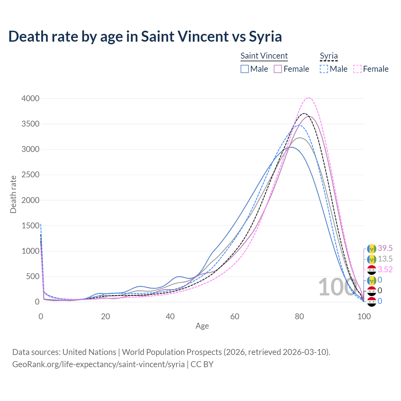 In Saint Vincent, the most common age of death is 80, compared to 82 in Syria. The median age of death is 75.6 in Saint Vincent and 77.7 in Syria, meaning only half of each cohort is expected to live past that age.