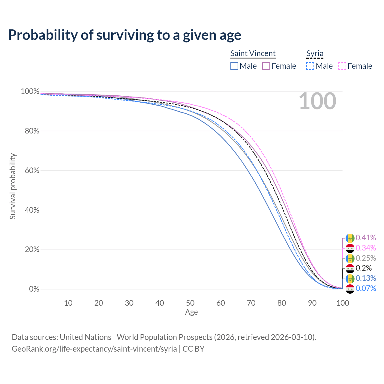 This life expectancy calculator shows the odds of living to 100, 95, 90, and below based on current age for both males and females in Saint Vincent and Syria, along with mean and median age of death. The calculations are based on the 2026 life tables (actuarial tables) from the UN World Population Prospects.