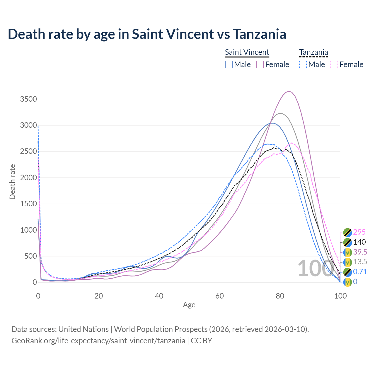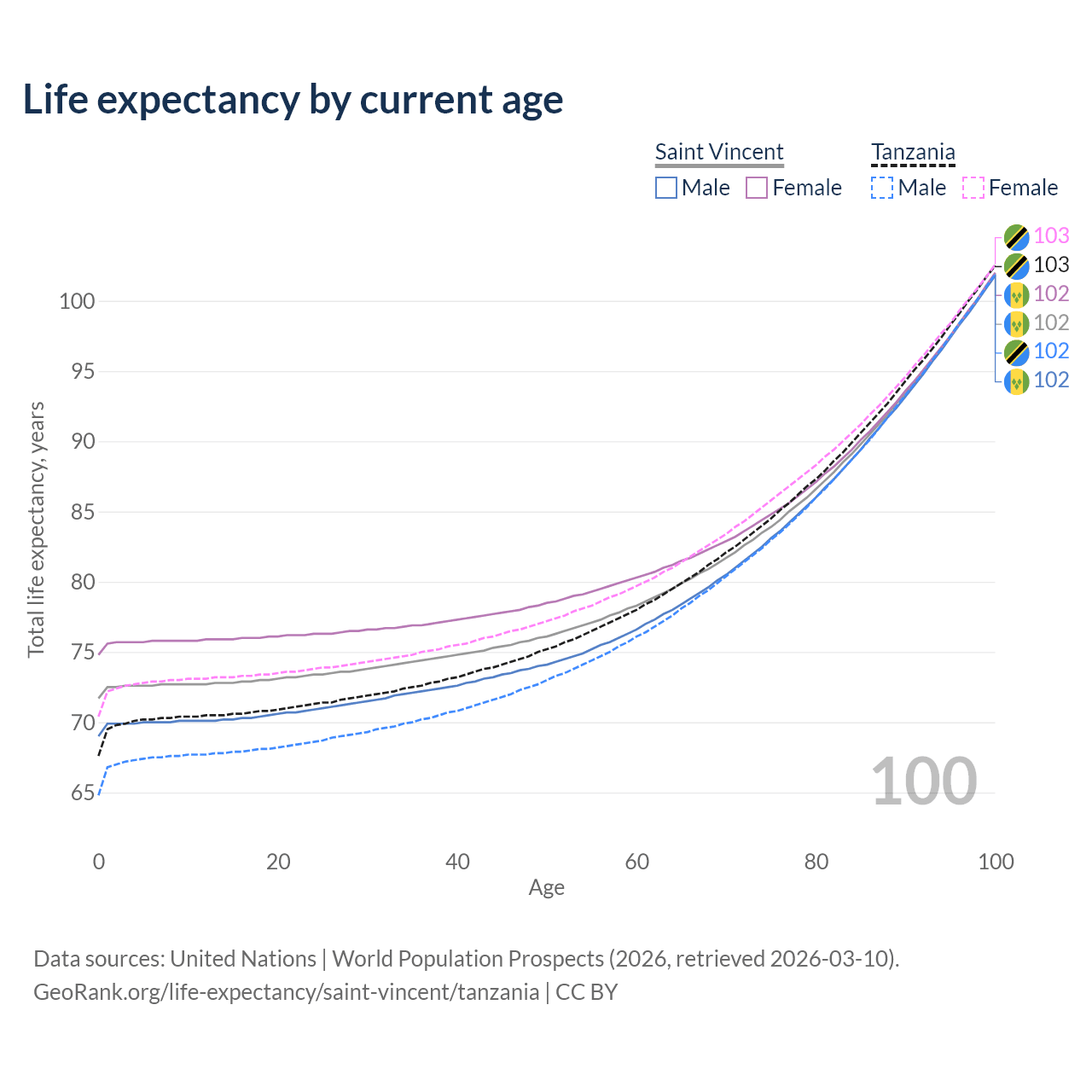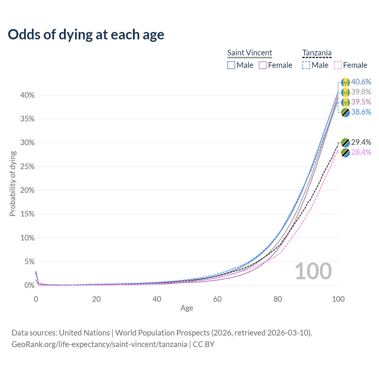 This life expectancy calculator shows the odds of living to 100, 95, 90, and below based on current age for both males and females in Saint Vincent and Tanzania, along with mean and median age of death. The calculations are based on the 2026 life tables (actuarial tables) from the UN World Population Prospects.