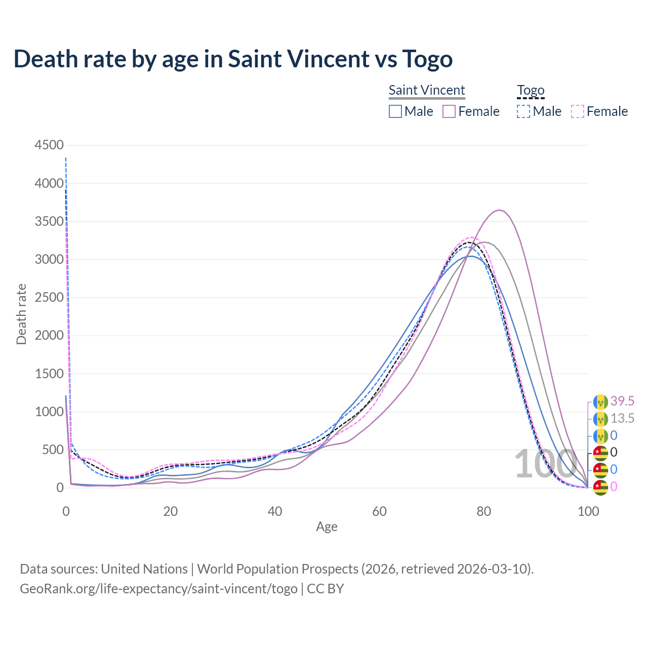 In Saint Vincent, the most common age of death is 80, compared to 0 in Togo. The median age of death is 75.6 in Saint Vincent and 71 in Togo, meaning only half of each cohort is expected to live past that age.