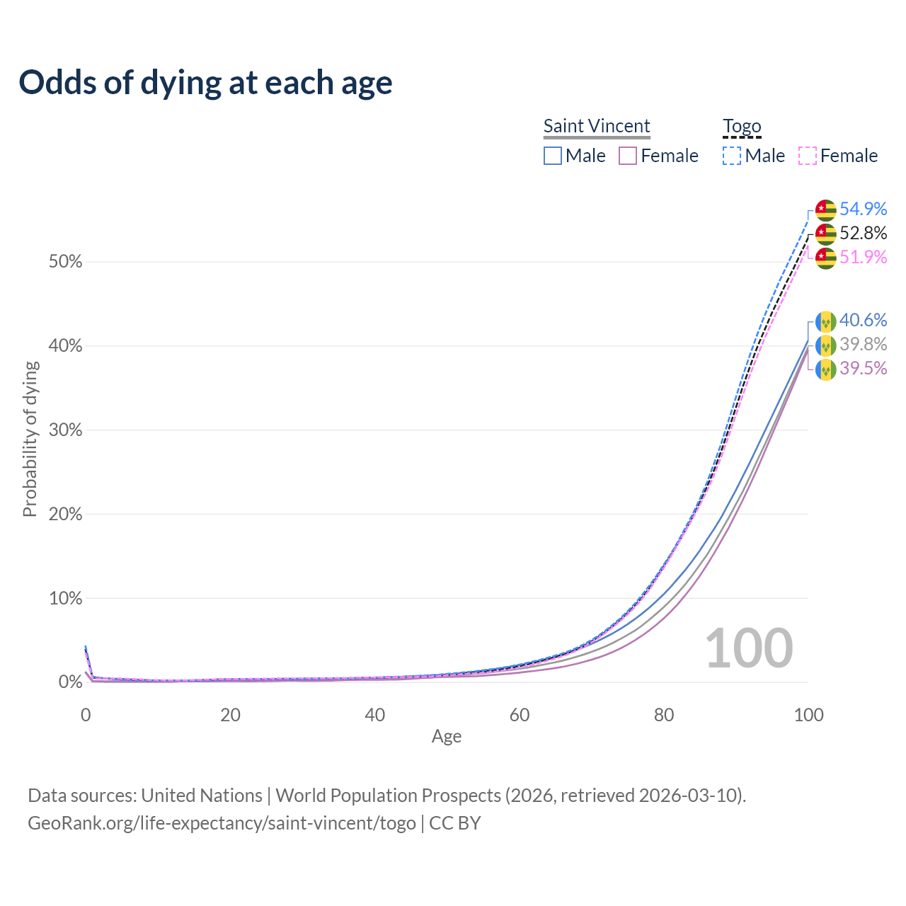 This life expectancy calculator shows the odds of living to 100, 95, 90, and below based on current age for both males and females in Saint Vincent and Togo, along with mean and median age of death. The calculations are based on the 2026 life tables (actuarial tables) from the UN World Population Prospects.