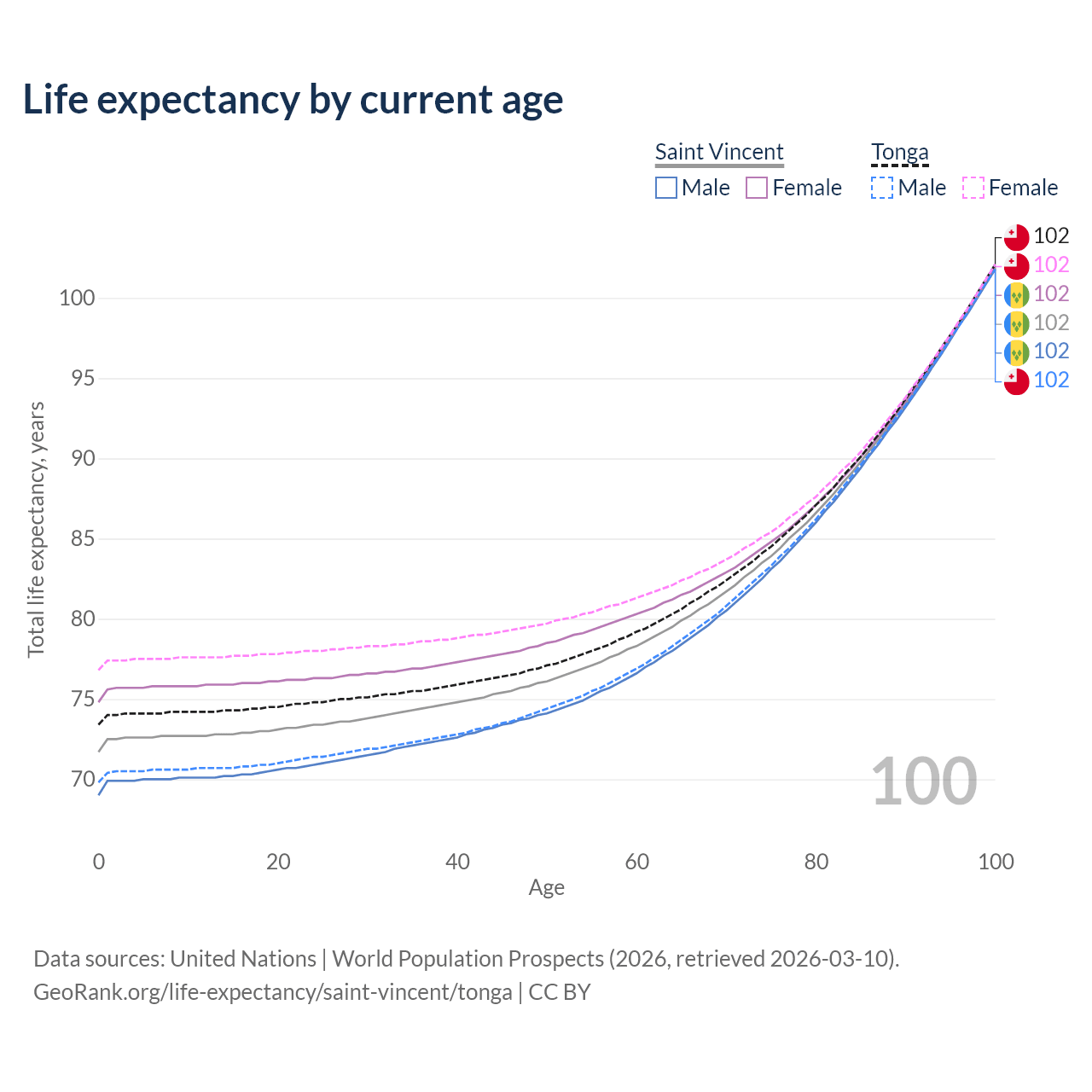 This life expectancy calculator shows the odds of living to 100, 95, 90, and below based on current age for both males and females in Saint Vincent and Tonga, along with mean and median age of death. The calculations are based on the 2026 life tables (actuarial tables) from the UN World Population Prospects.