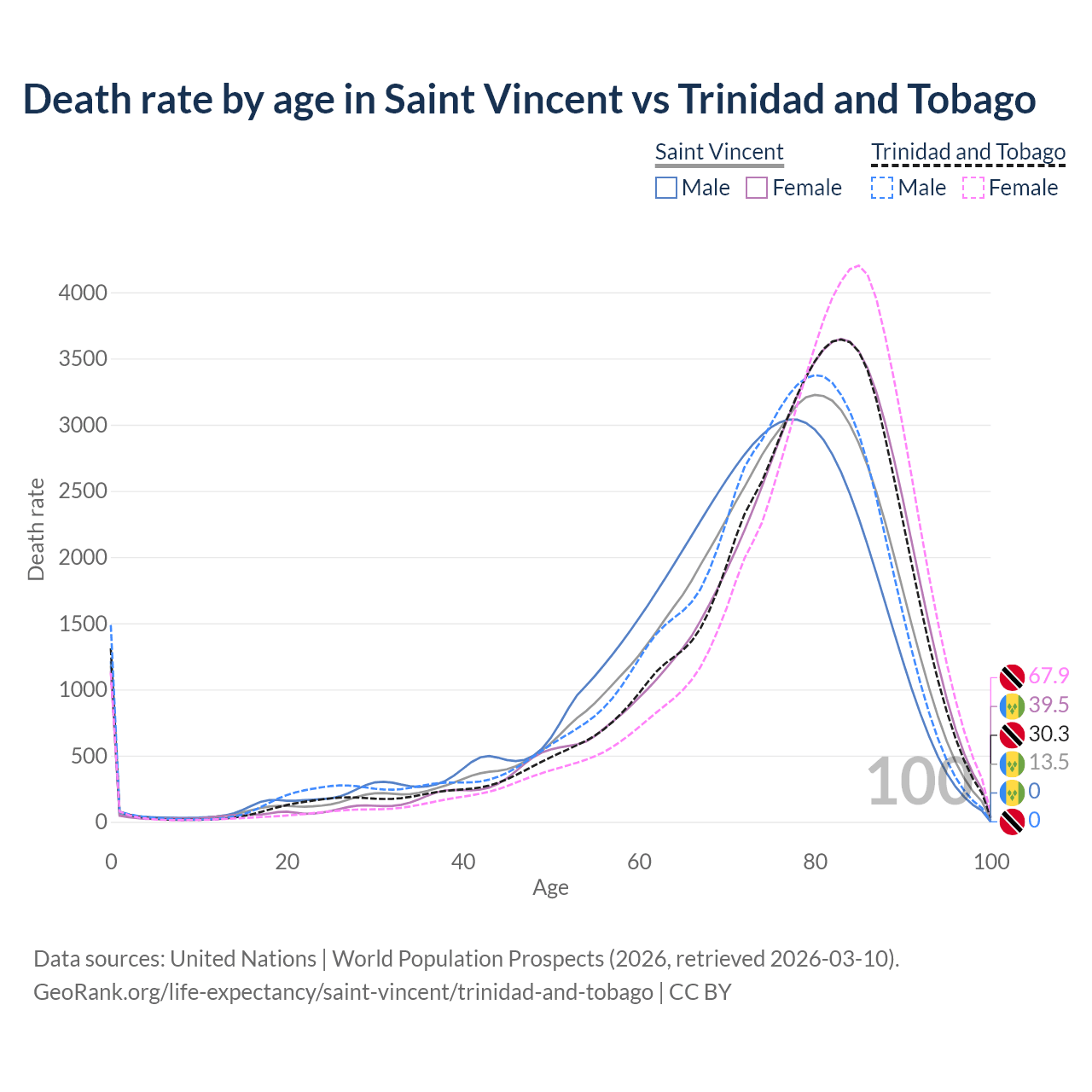 In Saint Vincent, the most common age of death is 80, compared to 83 in Trinidad and Tobago. The median age of death is 75.6 in Saint Vincent and 78.4 in Trinidad and Tobago, meaning only half of each cohort is expected to live past that age.