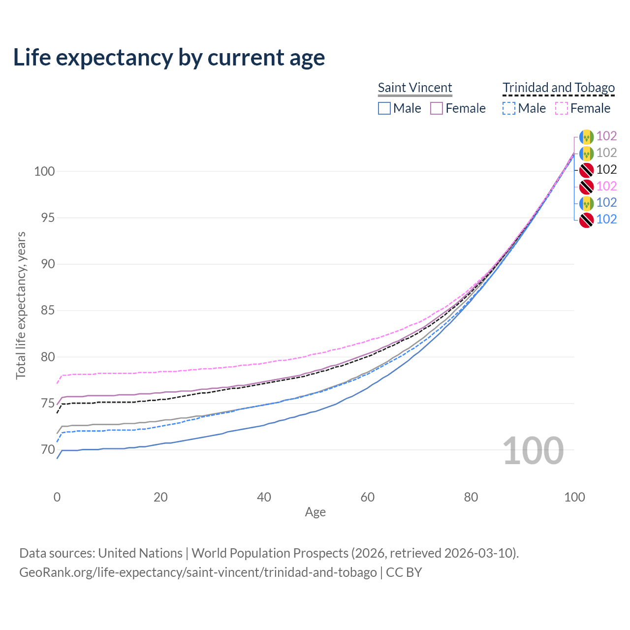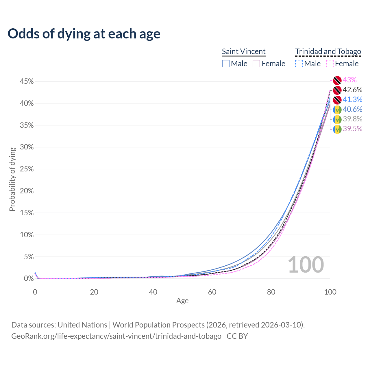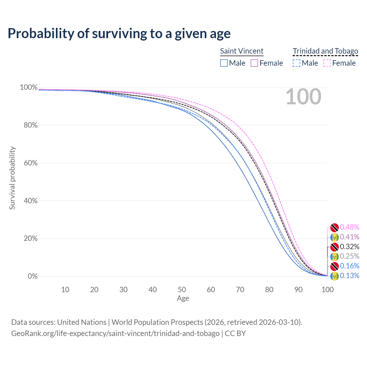 This life expectancy calculator shows the odds of living to 100, 95, 90, and below based on current age for both males and females in Saint Vincent and Trinidad and Tobago, along with mean and median age of death. The calculations are based on the 2026 life tables (actuarial tables) from the UN World Population Prospects.