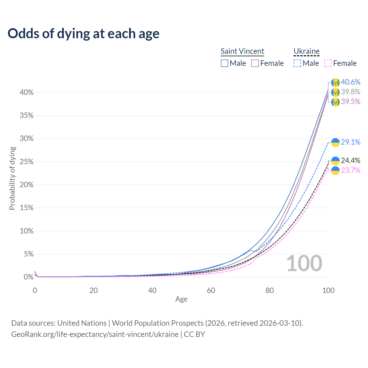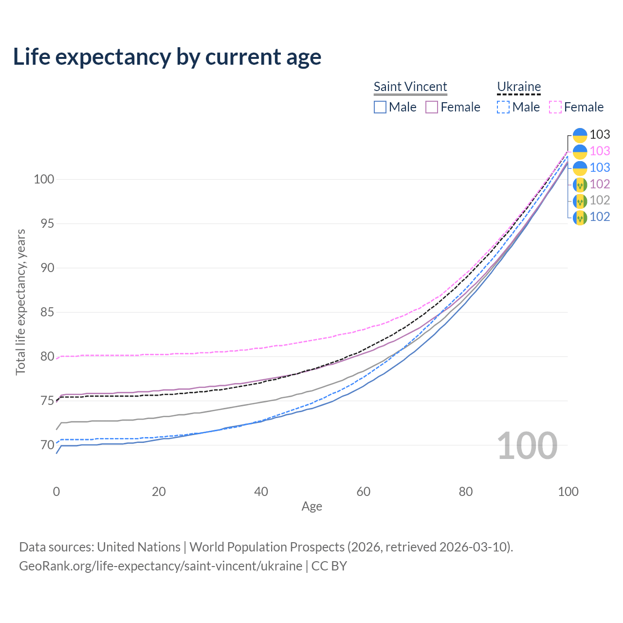 This life expectancy calculator shows the odds of living to 100, 95, 90, and below based on current age for both males and females in Saint Vincent and Ukraine, along with mean and median age of death. The calculations are based on the 2026 life tables (actuarial tables) from the UN World Population Prospects.