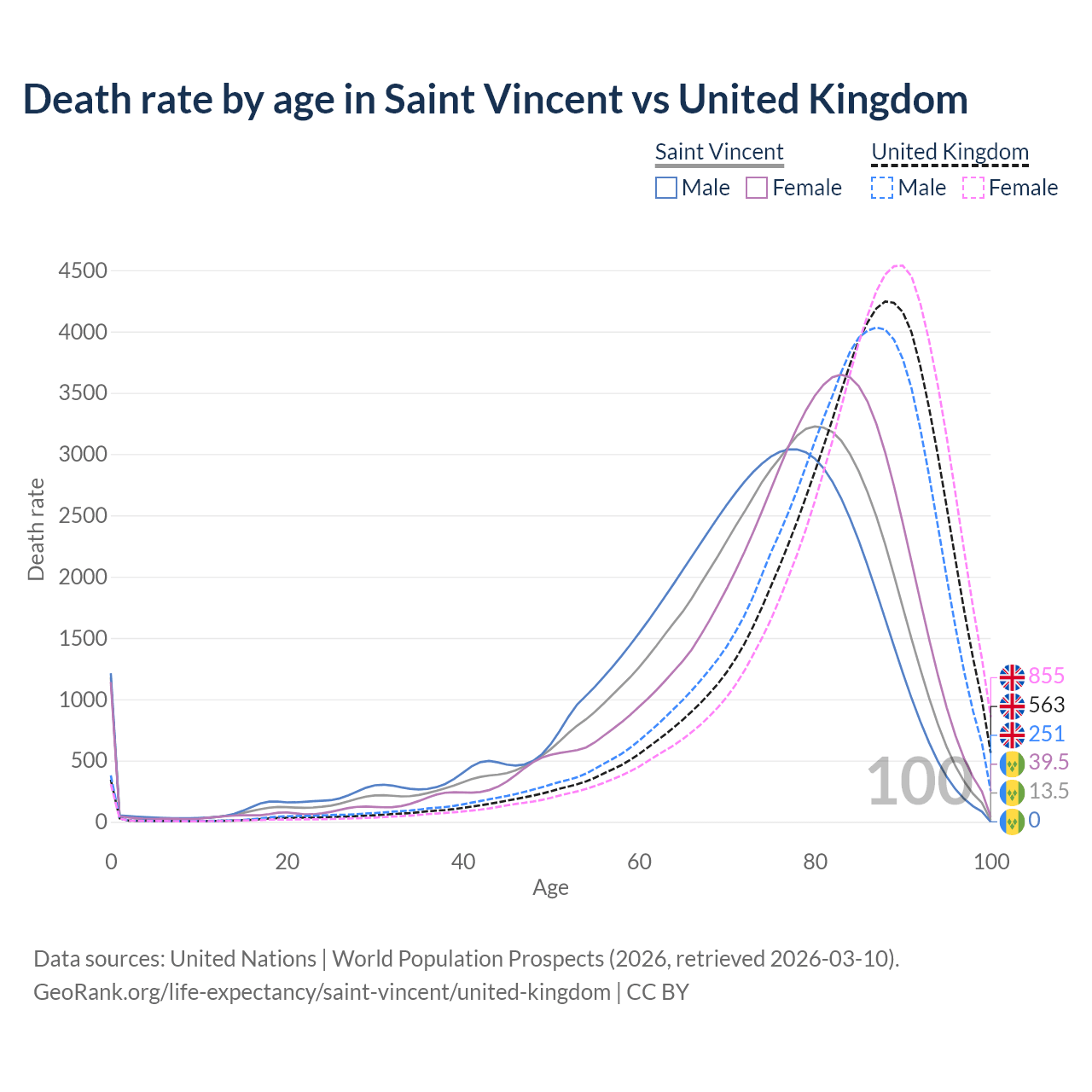 This life expectancy calculator shows the odds of living to 100, 95, 90, and below based on current age for both males and females in Saint Vincent and the United Kingdom, along with mean and median age of death. The calculations are based on the 2026 life tables (actuarial tables) from the UN World Population Prospects.