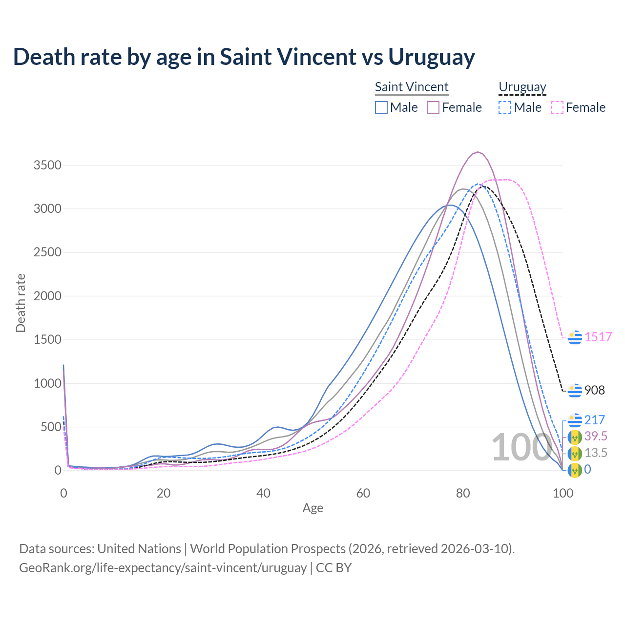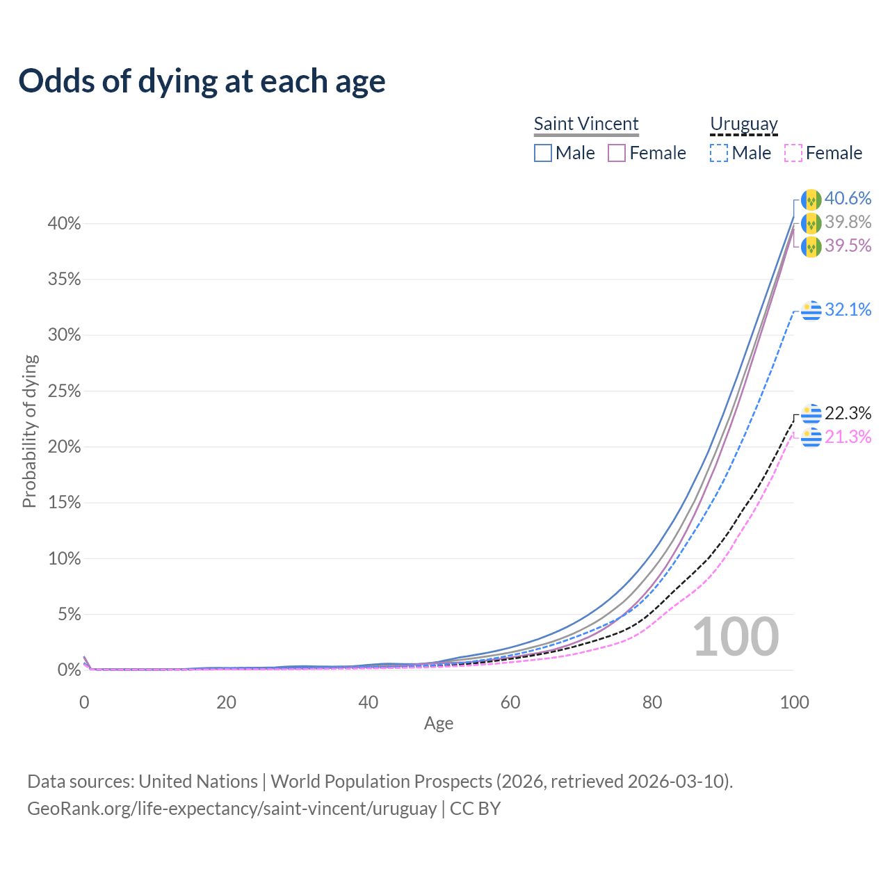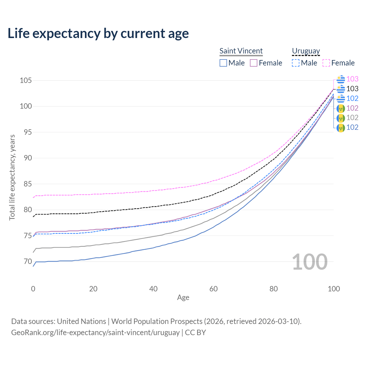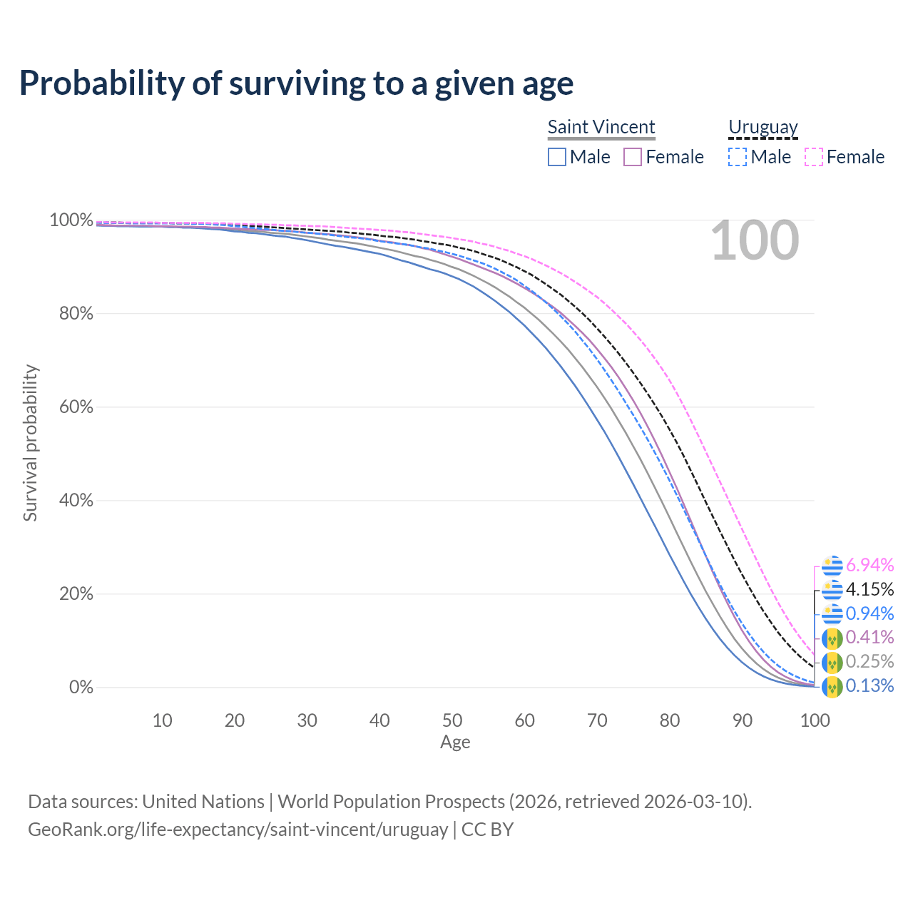 This life expectancy calculator shows the odds of living to 100, 95, 90, and below based on current age for both males and females in Saint Vincent and Uruguay, along with mean and median age of death. The calculations are based on the 2026 life tables (actuarial tables) from the UN World Population Prospects.