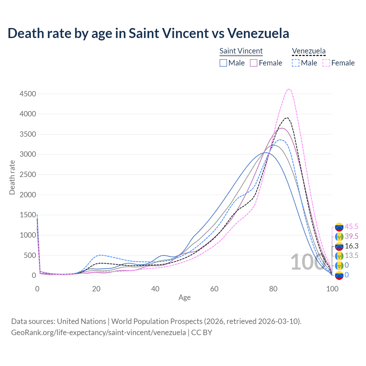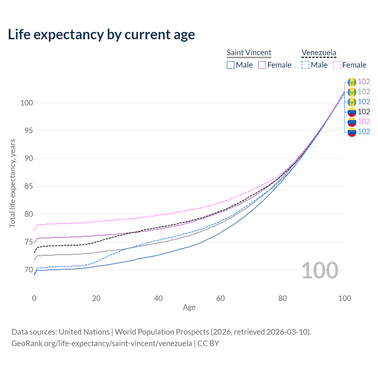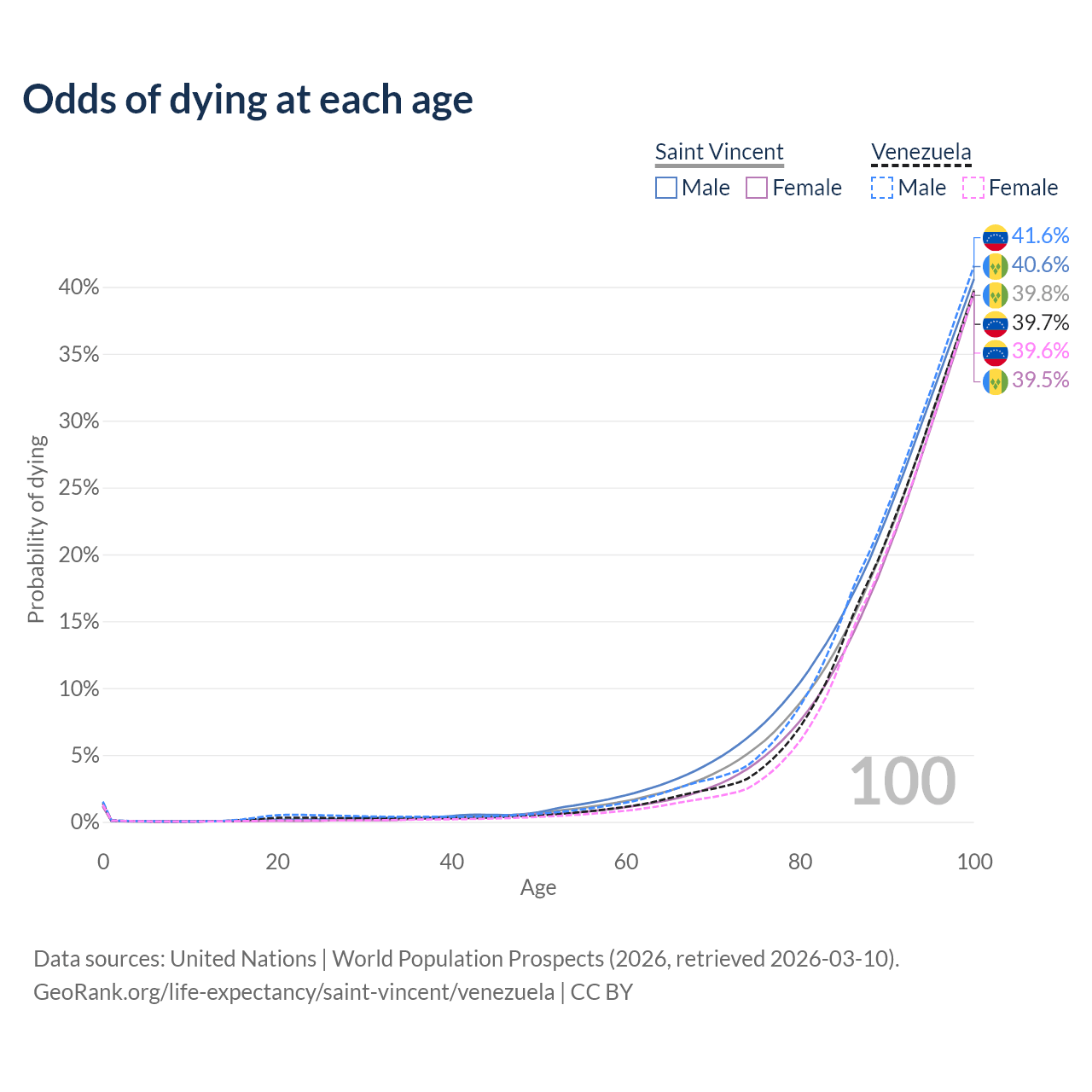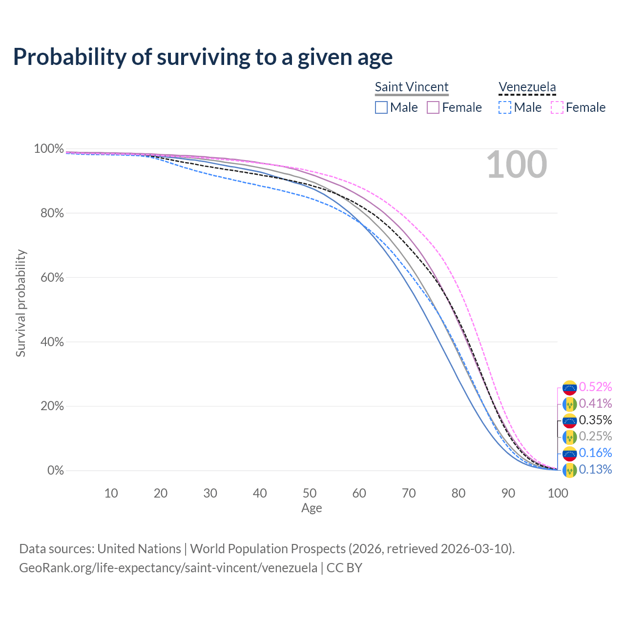 This life expectancy calculator shows the odds of living to 100, 95, 90, and below based on current age for both males and females in Saint Vincent and Venezuela, along with mean and median age of death. The calculations are based on the 2026 life tables (actuarial tables) from the UN World Population Prospects.