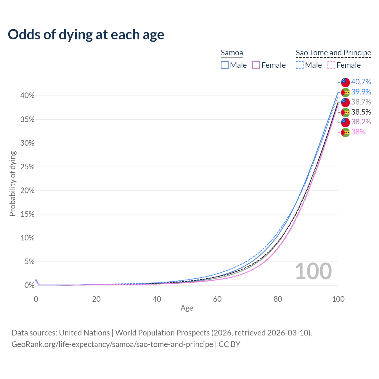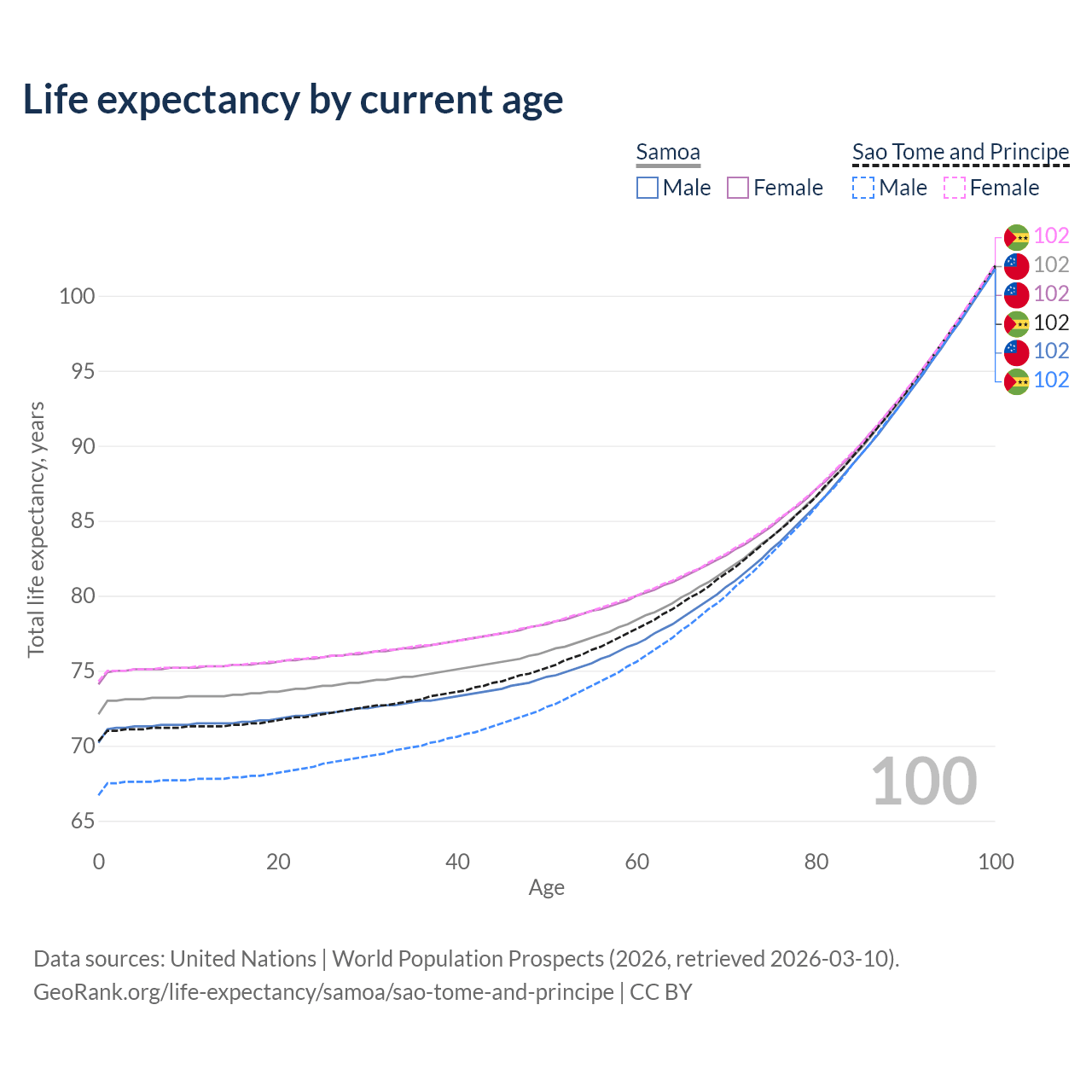 This life expectancy calculator shows the odds of living to 100, 95, 90, and below based on current age for both males and females in Samoa and Sao Tome and Principe, along with mean and median age of death. The calculations are based on the 2026 life tables (actuarial tables) from the UN World Population Prospects.