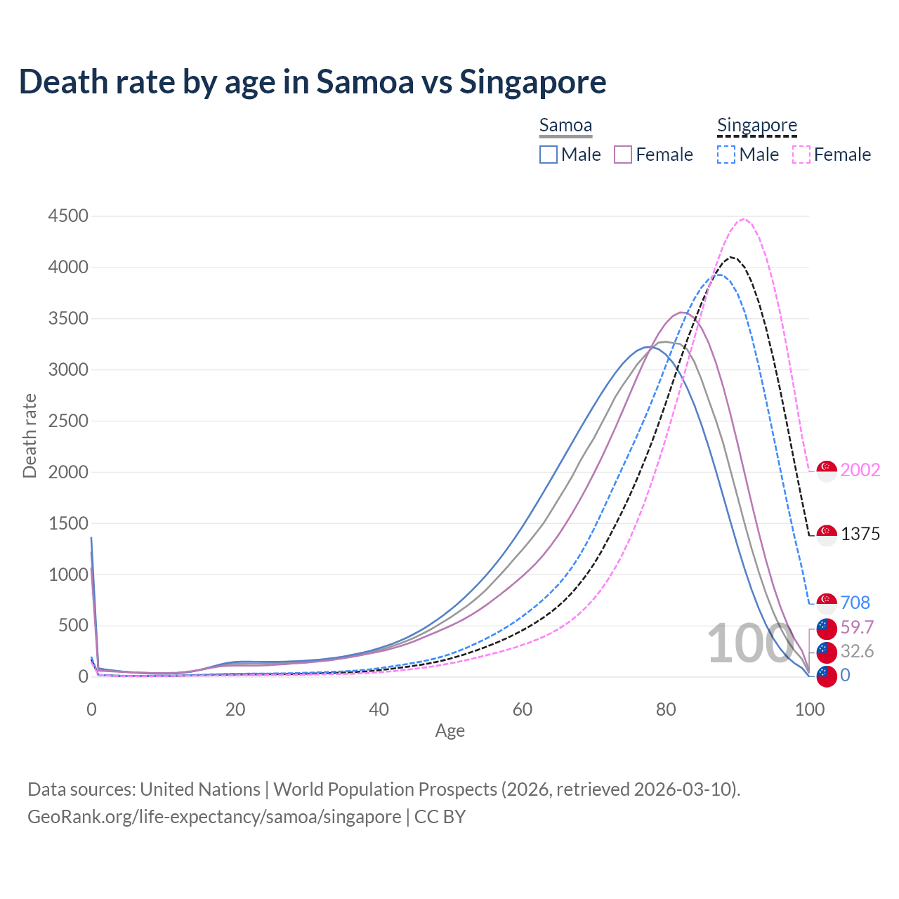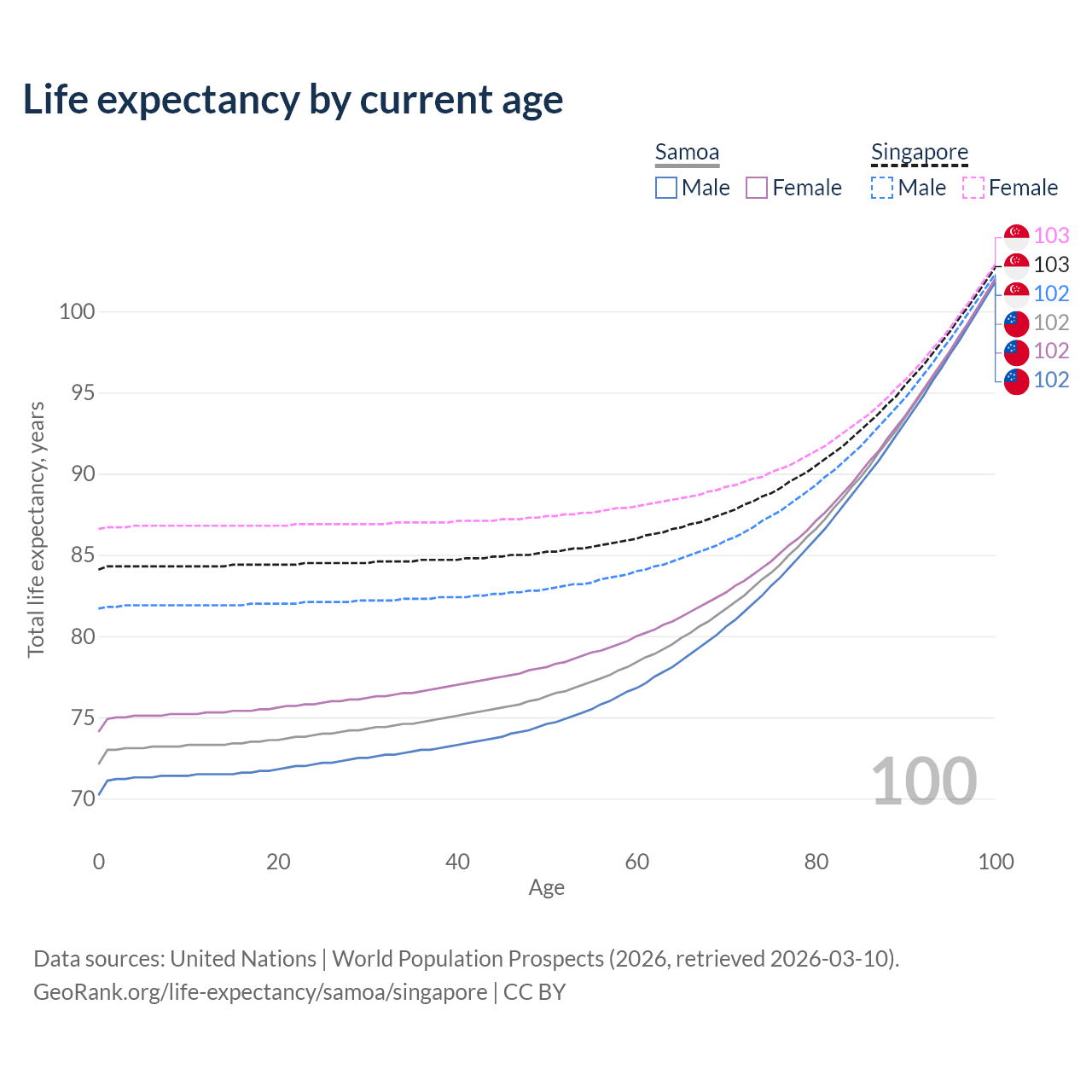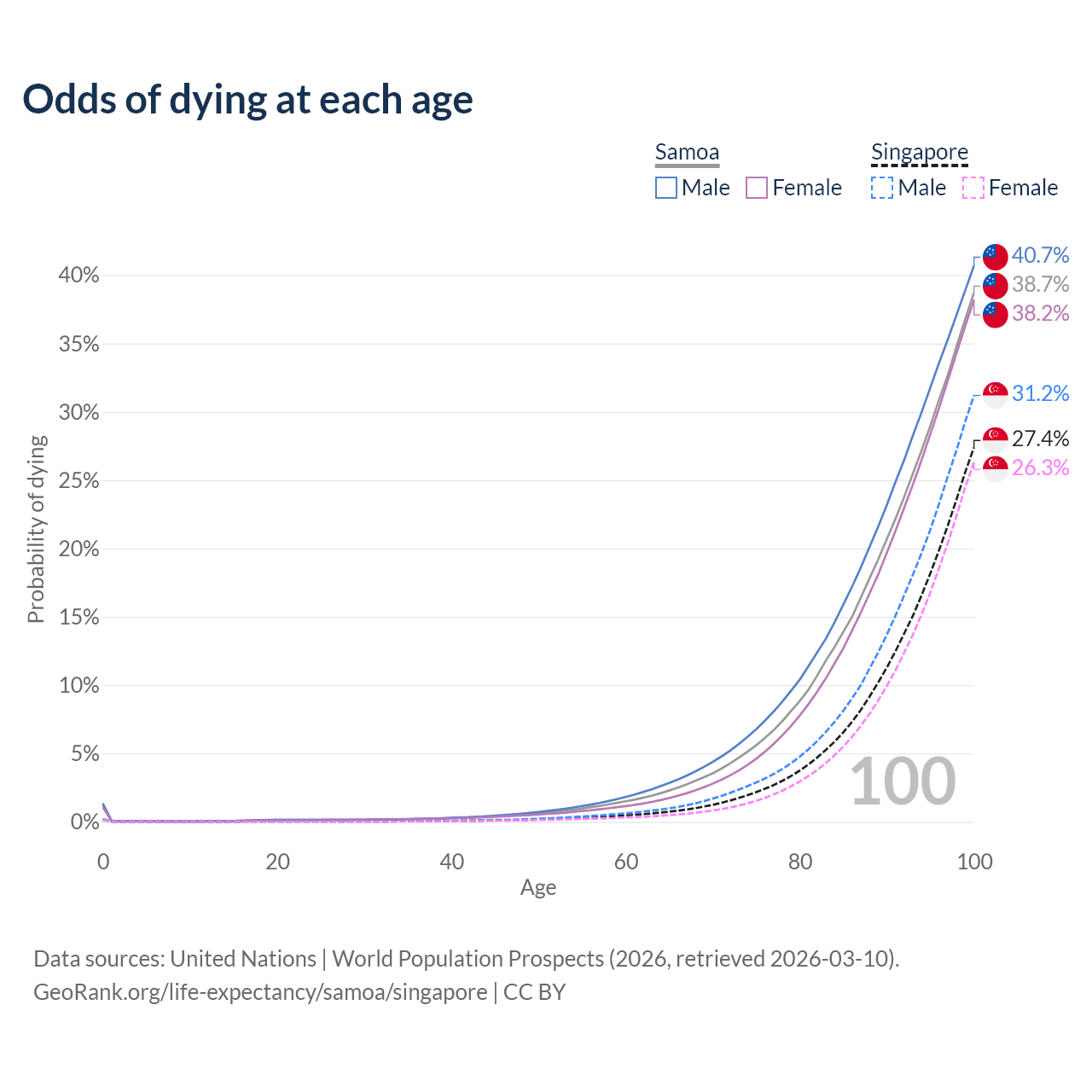 This life expectancy calculator shows the odds of living to 100, 95, 90, and below based on current age for both males and females in Samoa and Singapore, along with mean and median age of death. The calculations are based on the 2026 life tables (actuarial tables) from the UN World Population Prospects.
