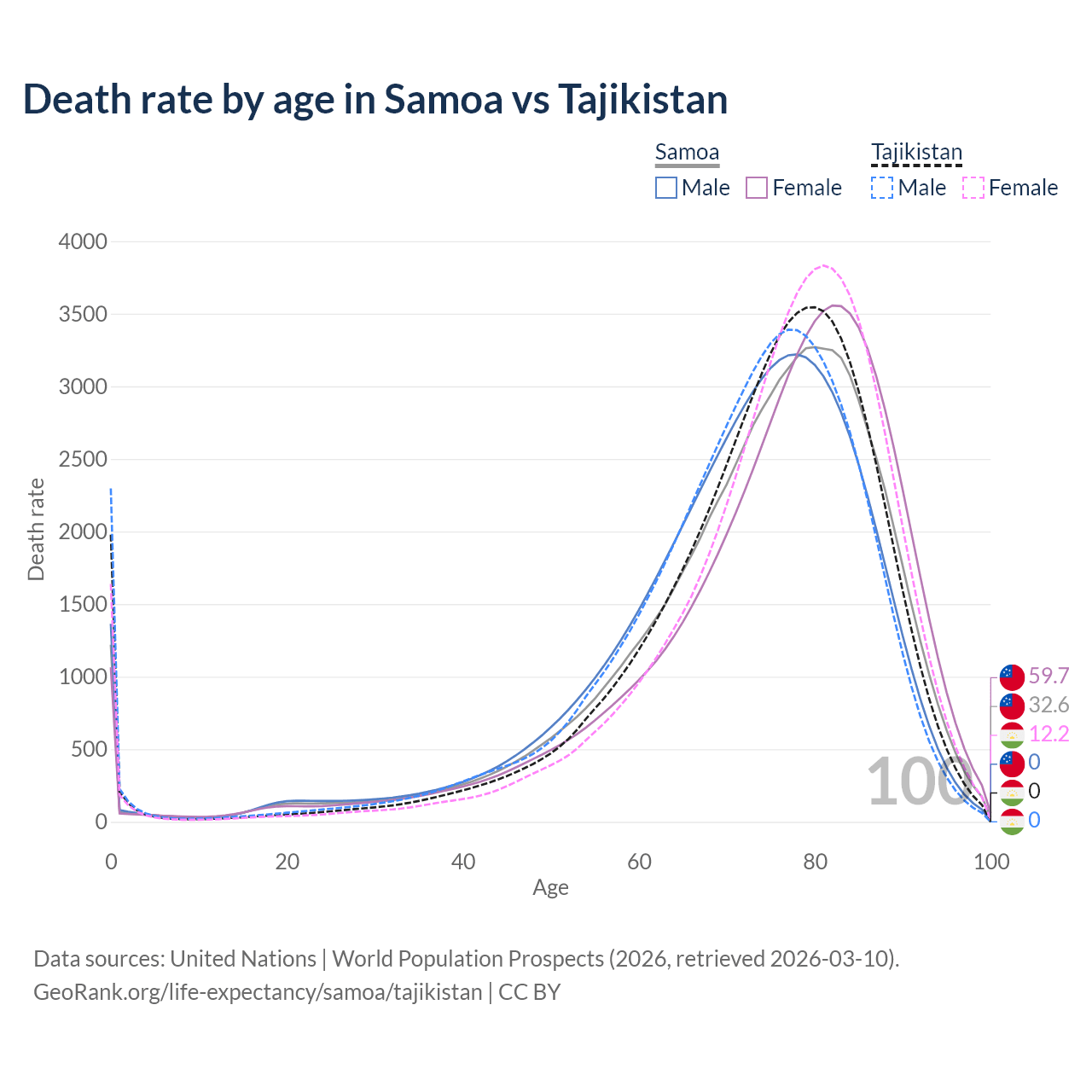 In Samoa, the most common age of death is 80, compared to 80 in Tajikistan. The median age of death is 75.9 in Samoa and 76 in Tajikistan, meaning only half of each cohort is expected to live past that age.
