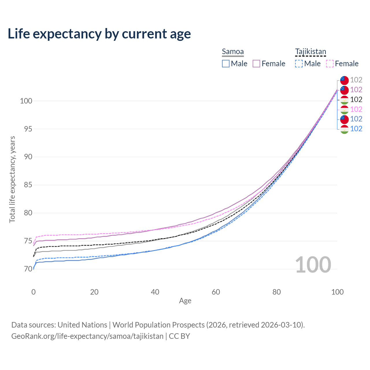 This life expectancy calculator shows the odds of living to 100, 95, 90, and below based on current age for both males and females in Samoa and Tajikistan, along with mean and median age of death. The calculations are based on the 2026 life tables (actuarial tables) from the UN World Population Prospects.