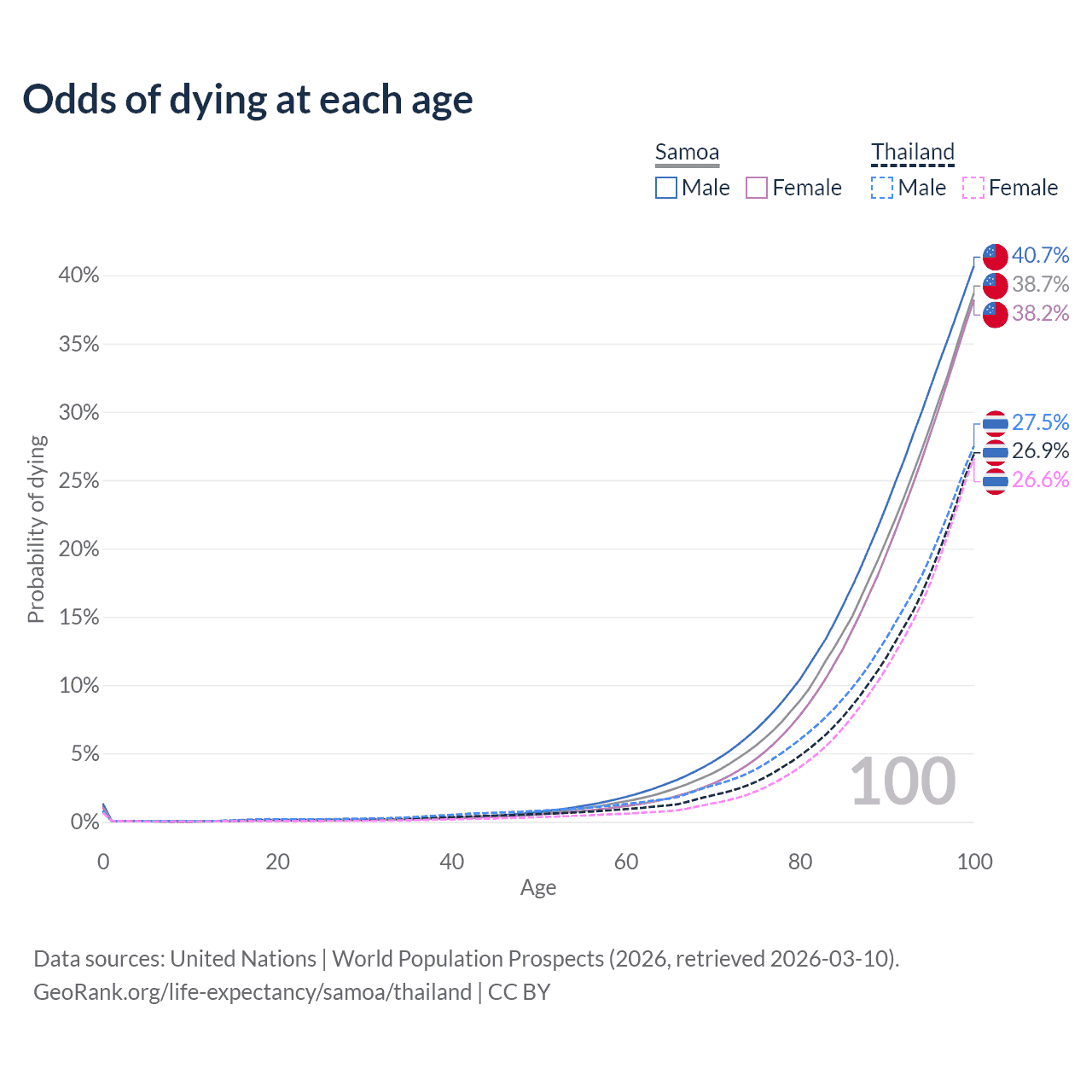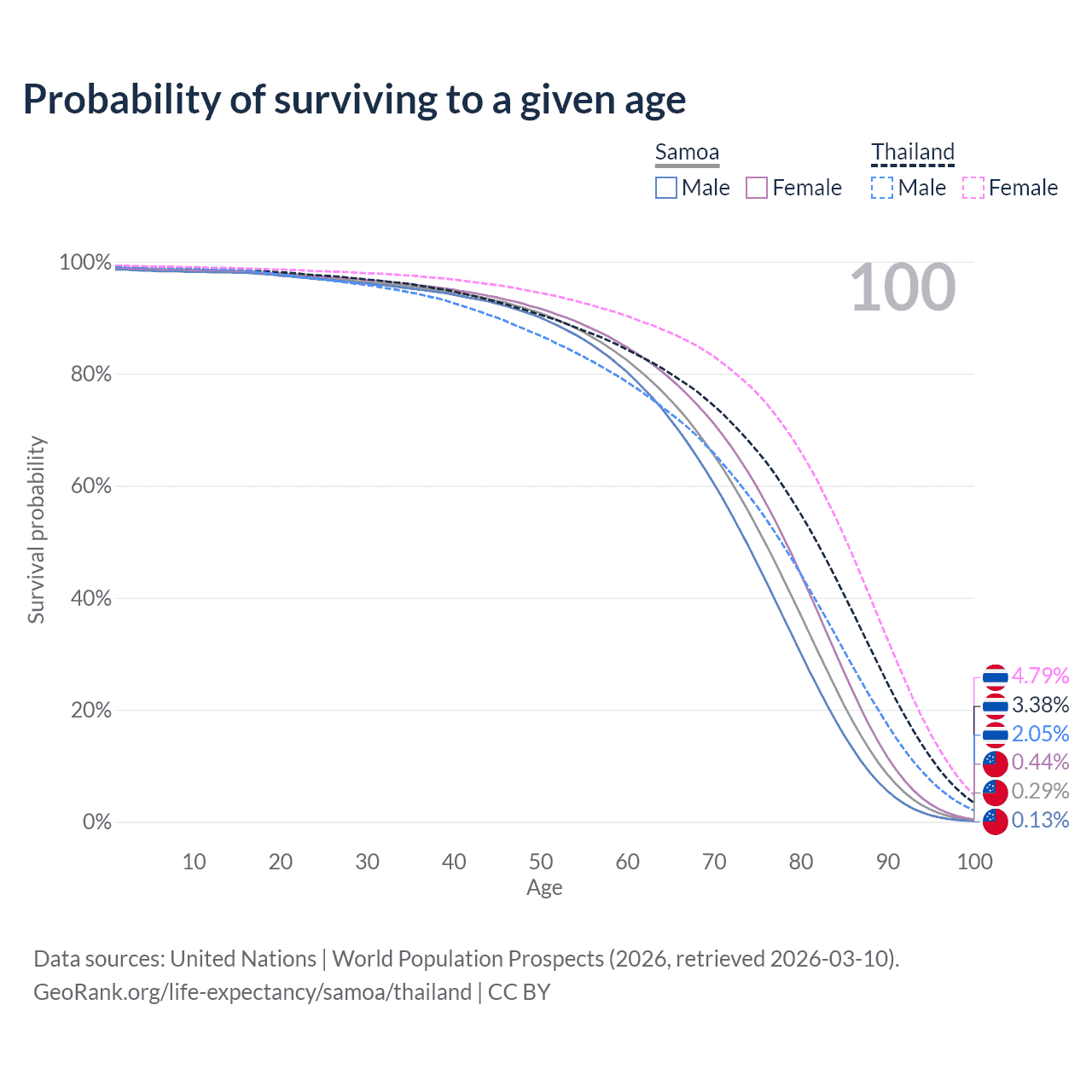 This life expectancy calculator shows the odds of living to 100, 95, 90, and below based on current age for both males and females in Samoa and Thailand, along with mean and median age of death. The calculations are based on the 2026 life tables (actuarial tables) from the UN World Population Prospects.