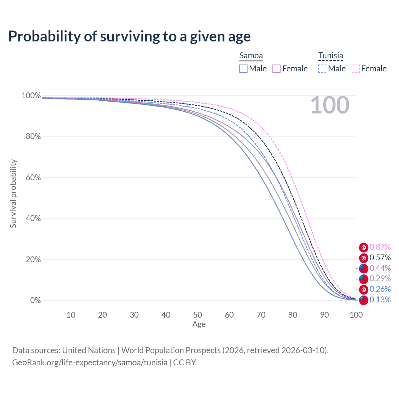 This life expectancy calculator shows the odds of living to 100, 95, 90, and below based on current age for both males and females in Samoa and Tunisia, along with mean and median age of death. The calculations are based on the 2026 life tables (actuarial tables) from the UN World Population Prospects.