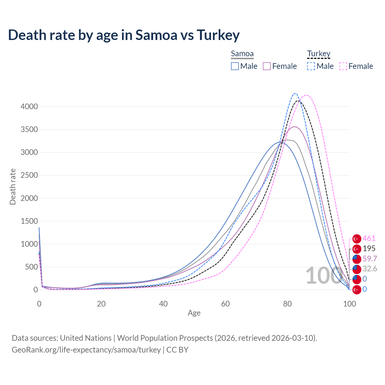 In Samoa, the most common age of death is 80, compared to 83 in Turkey. The median age of death is 75.9 in Samoa and 81.4 in Turkey, meaning only half of each cohort is expected to live past that age.