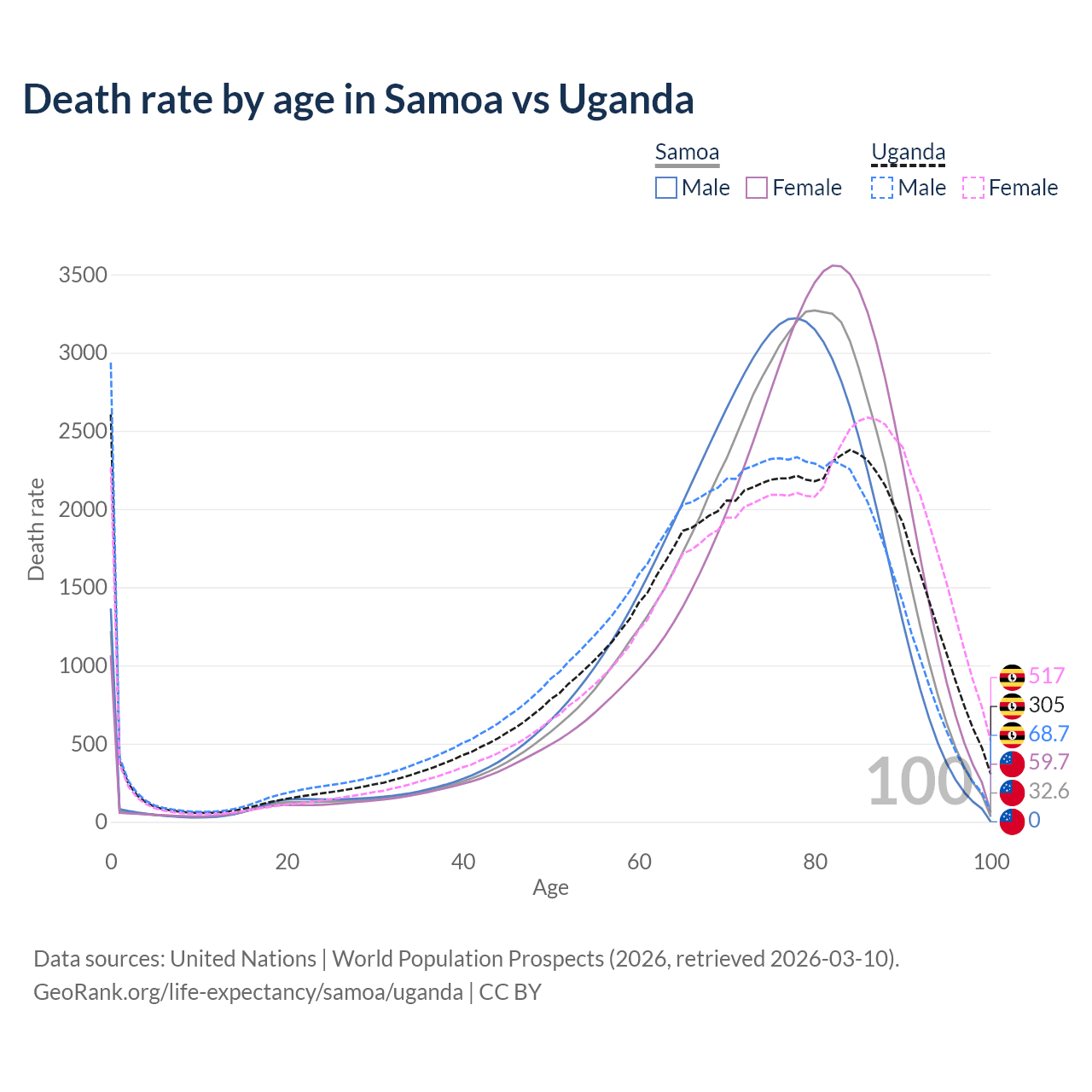 In Samoa, the most common age of death is 80, compared to 0 in Uganda. The median age of death is 75.9 in Samoa and 73.3 in Uganda, meaning only half of each cohort is expected to live past that age.