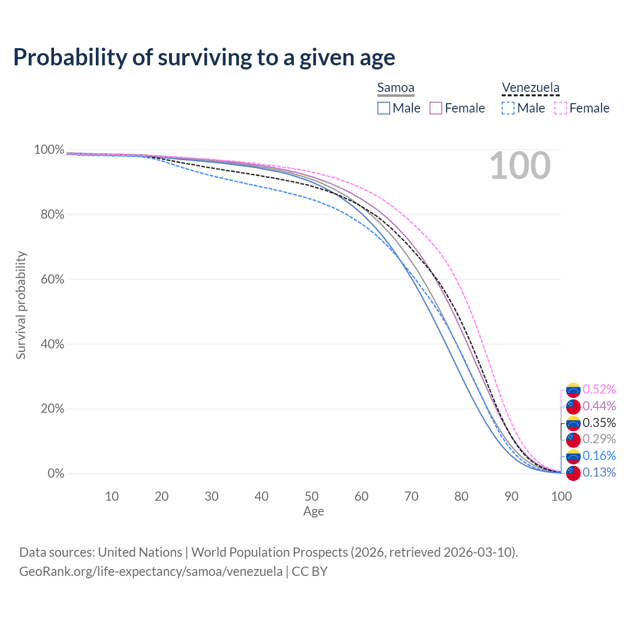This life expectancy calculator shows the odds of living to 100, 95, 90, and below based on current age for both males and females in Samoa and Venezuela, along with mean and median age of death. The calculations are based on the 2026 life tables (actuarial tables) from the UN World Population Prospects.